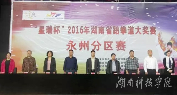 本网讯 4月23日至24日,2016年湖南省跆拳道大奖赛永州分区赛在我校举行。副校长李常健、程智开,湖南省跆协副秘书长王卫华及体育学院党总支书记何智强、副院长刘根发出席。