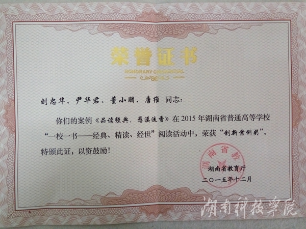 本网讯(通讯员 楚天雨) 1月6日,从2015年湖南省高校图书馆学术年会传来喜讯,我校图书馆刘忠华、尹华君、董小朋、唐维联合编写的案例《品读经典,愚溪流香》,在2015年湖南省普通高等学校“一校一书——经典、精读、经世”阅读活动中,荣获“创新案例奖”。