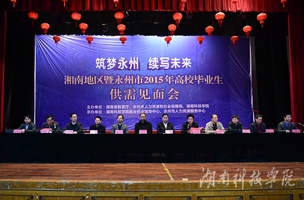 湖南省人力资源和社会保障厅巡视员曾坤,湖南省人力资源服务中心副主任戴小兵,湖南省大中专学校学生信息咨询与就业指导中心副主任钟秋明,永州市委常委、常务副市长唐湘林,永州市人大副主任郑柏顺,永州市政协副主席唐运军,永州市委组织部副部长、市人力资源和社会保障局党组书记、局长唐树成,我校党委书记陈弘、校长曾宝成、党委副书记唐艳明、副校长李常健、吴小林、程智开等出席。开幕式由程智开主持。