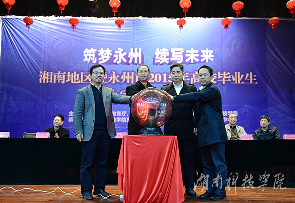 曾坤、唐湘林、陈弘、钟秋明共同按下启动球,开通“掌上求职—湘科院就业创业微信公众平台”。