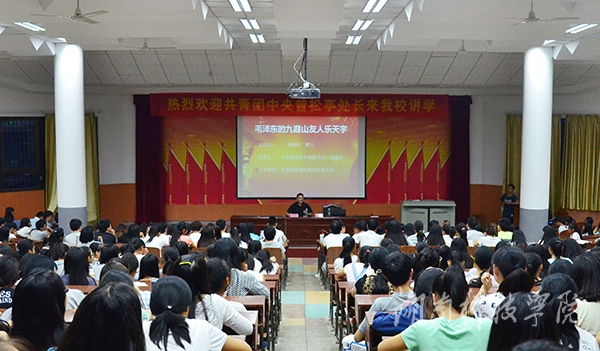本网讯(记者 龙夏萍 摄影 刘信)9月28日晚,共青团中央青年志愿者工作部文化宣传处处长曾松亭应邀来校,与同学们共品红色经典《毛泽东的九嶷山友人乐天宇》。副校长程智开出席,讲座由永州团市委副书记唐超学主持。