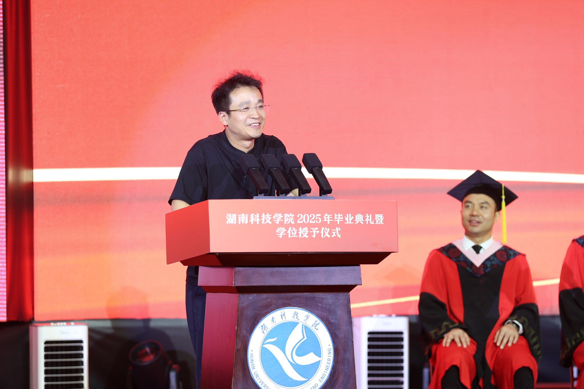 优秀校友代表、我校2007届法律系法学专业毕业生、永州市中新再生资源有限公司董事长杨家乐以《根植沃土,做好人生跨界者和奋斗者》为题,对全体毕业生表示热烈的祝贺和殷切的祝福,他希望毕业生们始终成为一名有温度、有情怀的奋斗者。