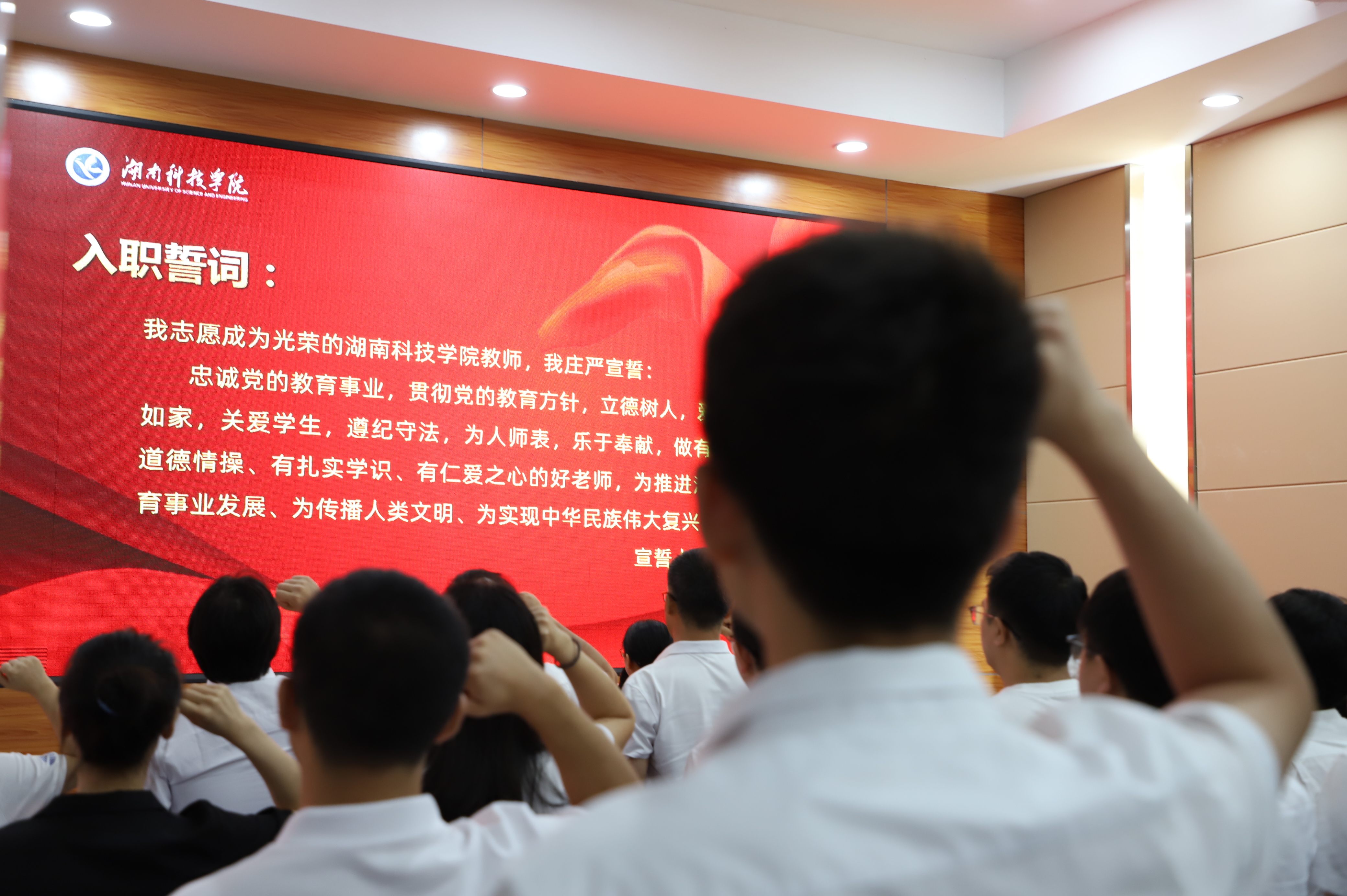 大会在庄严的国歌声中拉开帷幕,2023年新进教师进行了入职宣誓,大家表示,要做有理想信念、有道德情操、有扎实知识、有仁爱之心的好老师。