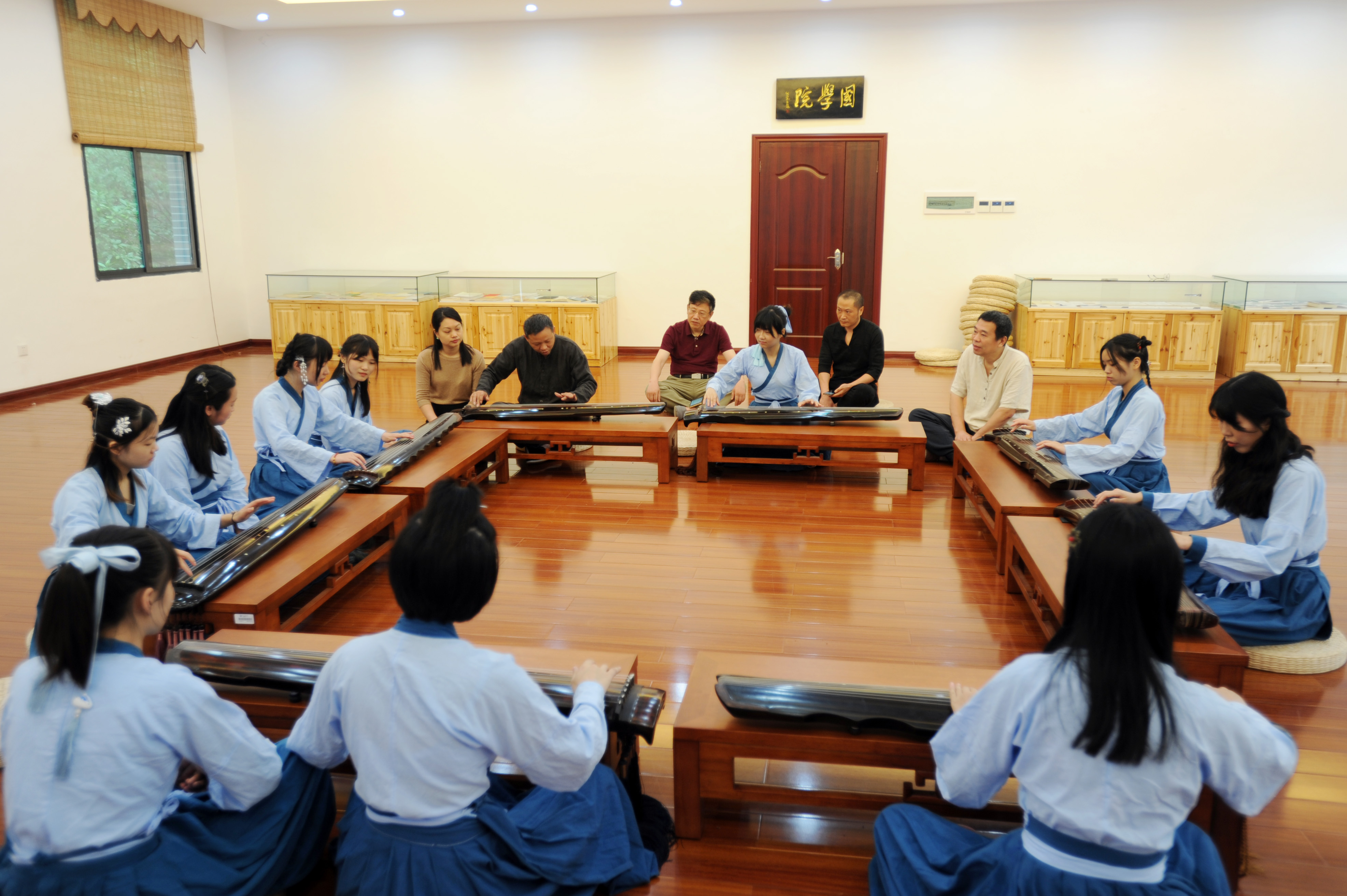 国学院的九疑古琴社积极培养古琴艺术人才,开展古琴文化交流,影响逐渐辐射到整个学校与地方社会。两年来,九疑古琴社已与永州圆道书院、凤和书社、潇湘意美术馆、瑜伽协会以及部分中小学校开展合作,在零陵、冷水滩、宁远、祁阳等地举办多次古琴雅集,为韩国训蒙斋儒林学者举办古琴表演,在九疑山紫霞洞举办“天籁箫韶、九疑琴韵”古琴专场音乐会,产生了良好的社会反响,《永州日报》、“红网”、“今日头条”、“永州新闻网”等主流媒体纷纷给予报道。