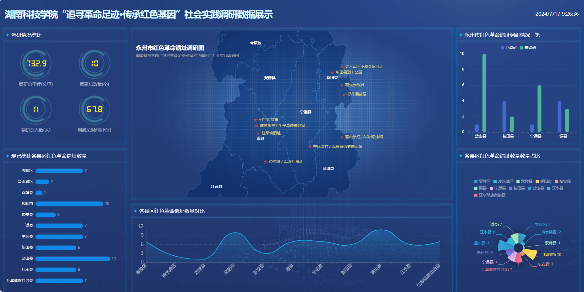 实地调研结束后,团队成员梳理和整合永州市红色文化资源,将永州地图作为底板,采用“互联网+地理信息”、虚拟现实等技术手段,以红色地标为切入点,嵌入人物、事件等要素,连点成线、以线推面,绘制了一张图文并茂的“红色地图”,共推荐红色教育基地13处。该地图直观呈现重要党史人物、重大事件和重要红色遗迹,使红色历史和长征精神更加可触可感。