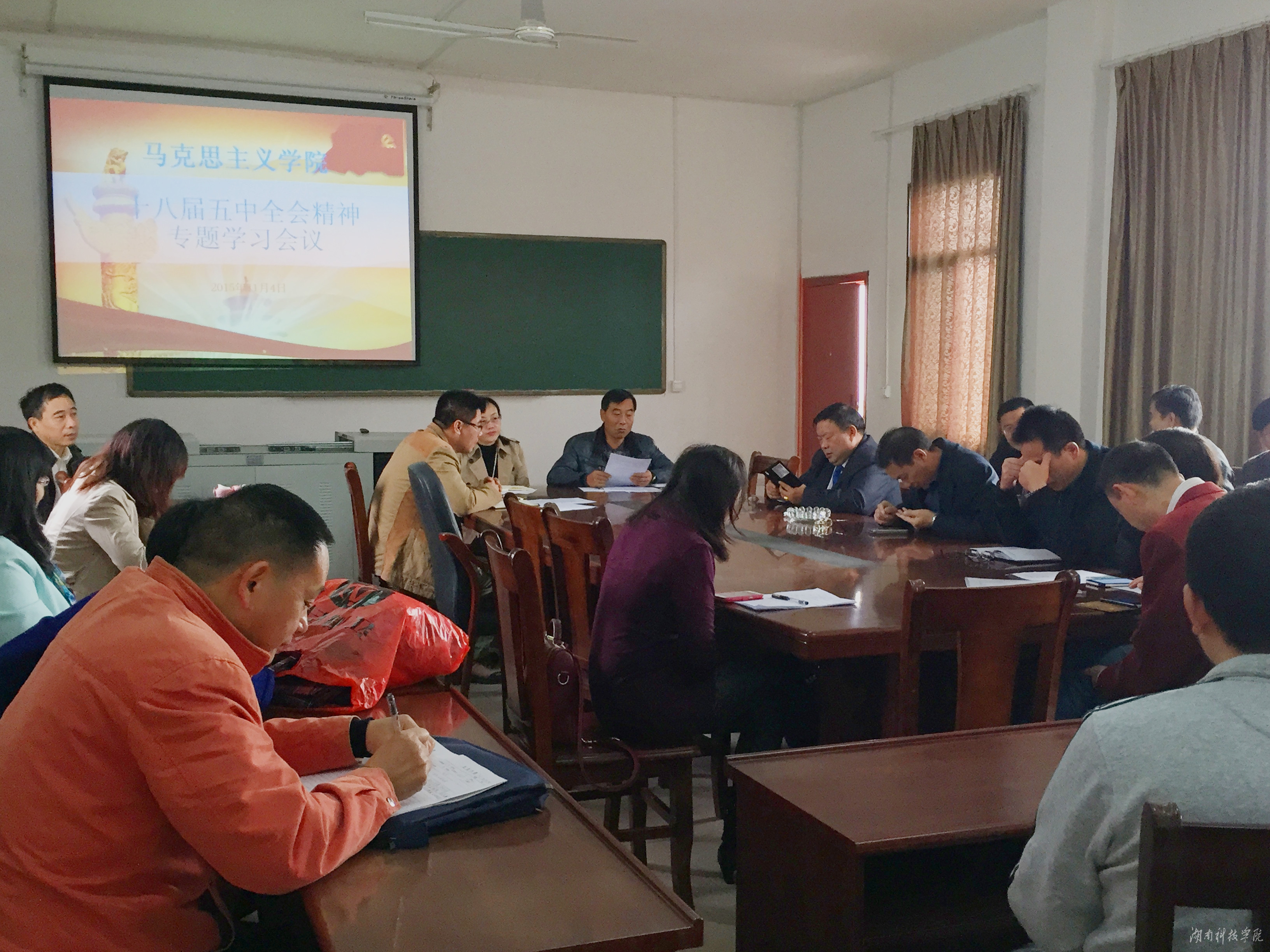 本网讯 (通讯员 李艳)11月4日上午,马克思主义学院组织全体教职员工集中学习党的十八届五中全会精神,会议认真学习了中国共产党第十八届中央委员会第五次全体会议公报。会议由该院党总支书记唐森树主持。