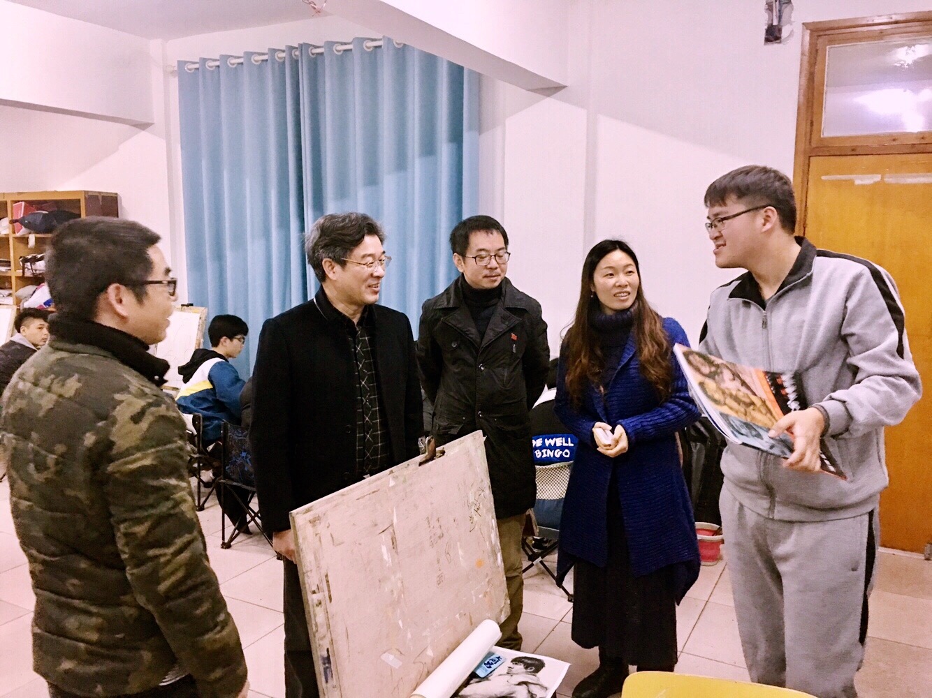 宋宏福一行首先来到了实习基地永州三中后湖国际艺术专业培训基地。今年12月初,美术与艺术设计学院2014级美术学专业(油画)25位学生进入永州三中后湖国际艺术艺体生专业培训基地进行为期两个月的实习,实习基地针对每位同学的专长进行了岗前专业培训,考核合格后分配到相对应的岗位。宋宏福通过召开座谈会、检查实习生教案和实习手册、现场查看指导学生情况、听取学生汇报课等方式,对实习情况进行了详细了解。同时他还询问了解同学们在实习中的收获以及遇到的困难。宋宏福指出,专业实习是同学们从学校走向社会的第一步,大家要主动转变角色,尽快适应环境,积极主动向老员工学习取经。同时业要发扬美术与艺术设计学院实践教学优势,为自己即将走向社会工作打下坚实的基础。