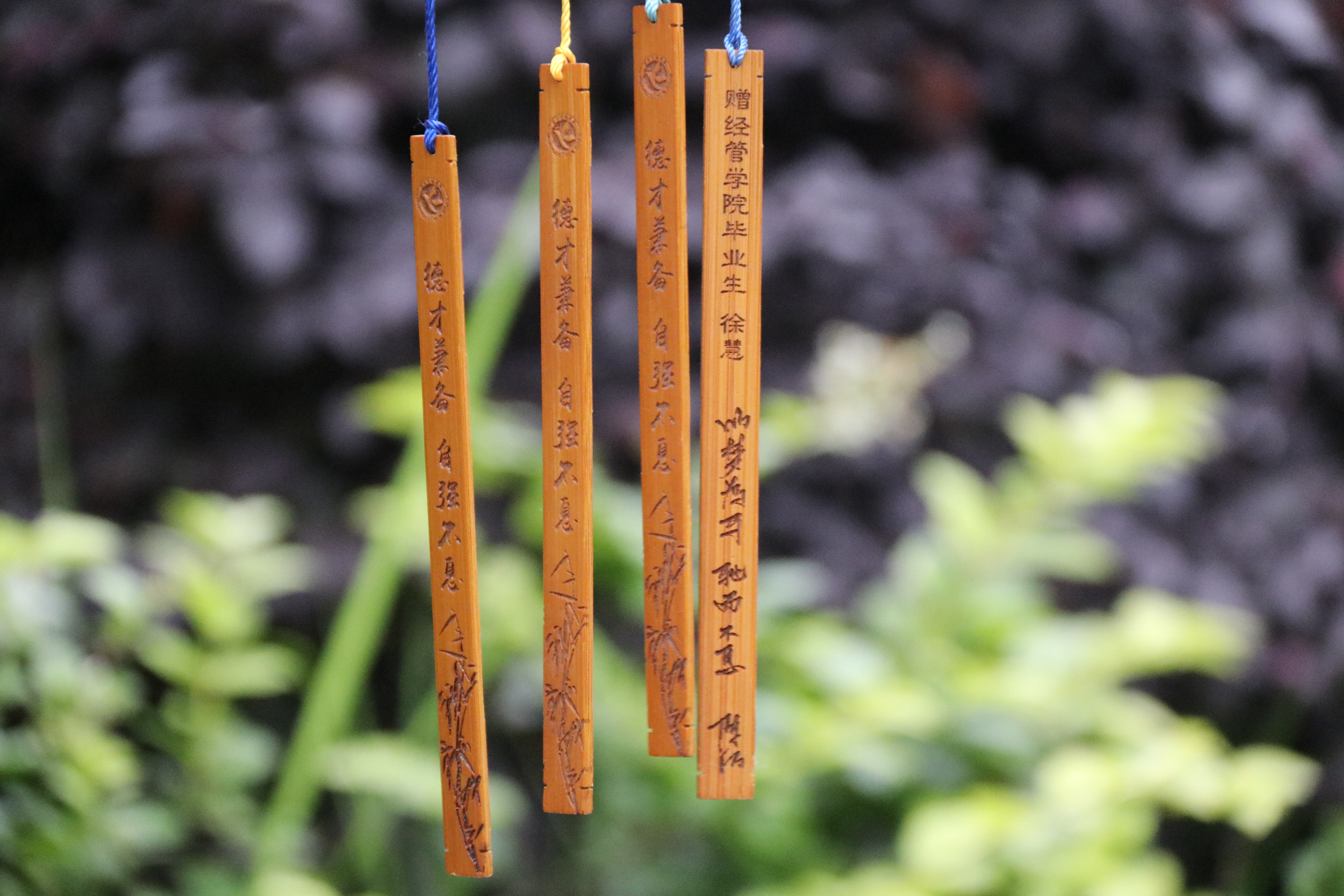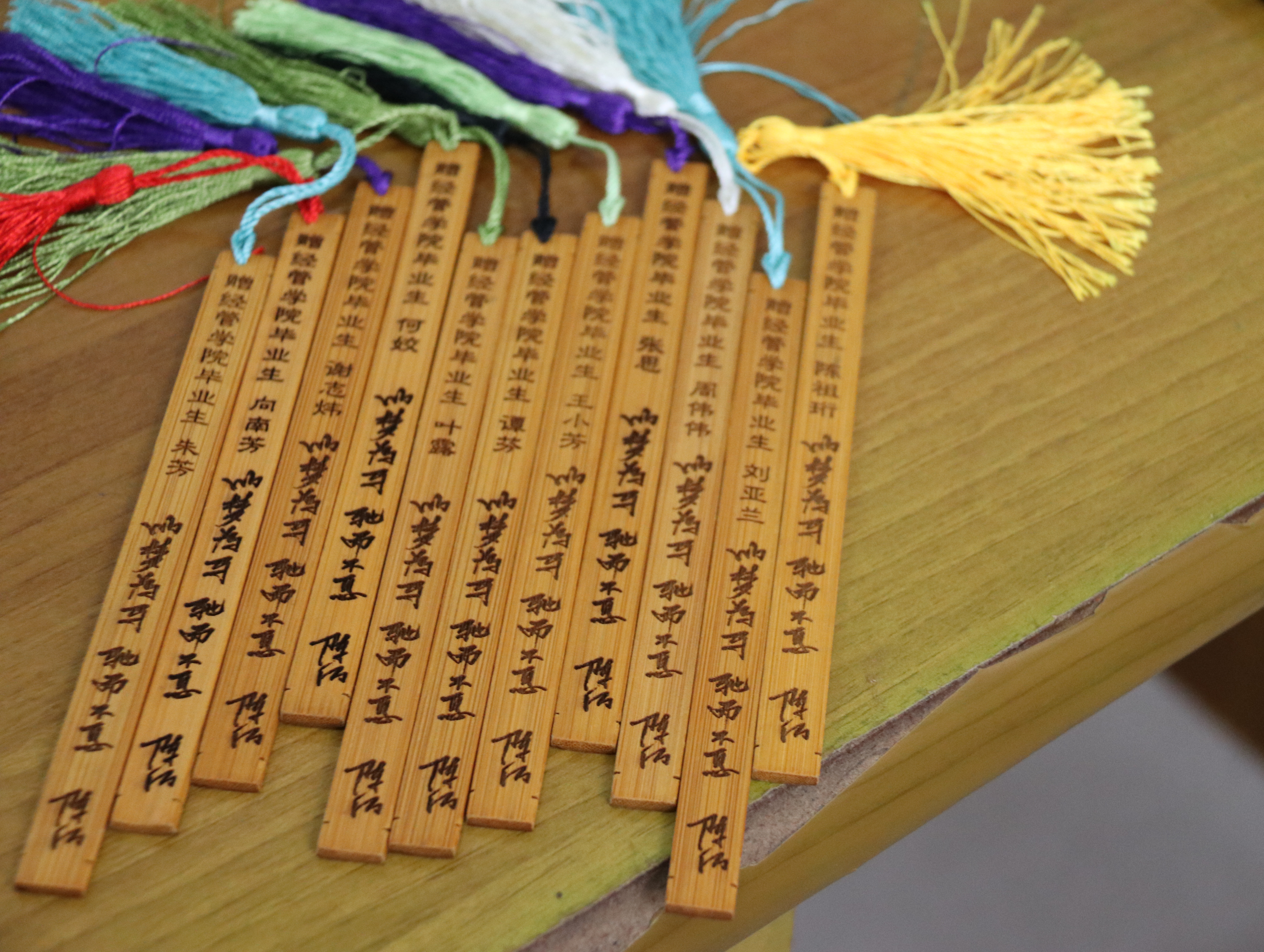 书签是木制长条形,一面刻有每一名毕业生的名字以及校党委书记陈弘书记“以梦为马,驰而不息”的寄语,希望每一位毕业生都能够怀着自己的梦想,永不停歇的愿望;另一面刻着九州在线网站的校徽和“德才兼备,自强不息”的校训,同时还刻有竹叶,寓意着挺拔洒脱、正直清高的品质。