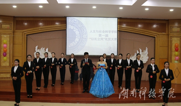 本网讯(记者 涂楚琪 钟卫香)为促进秘书学专业的实践教学,提升学生的秘书技能, 11月13日晚,人文与社会科学学院在明德楼二楼多功能厅举办首届“以礼立风”礼仪大赛。该院党总支书记杨能山等担任评委。