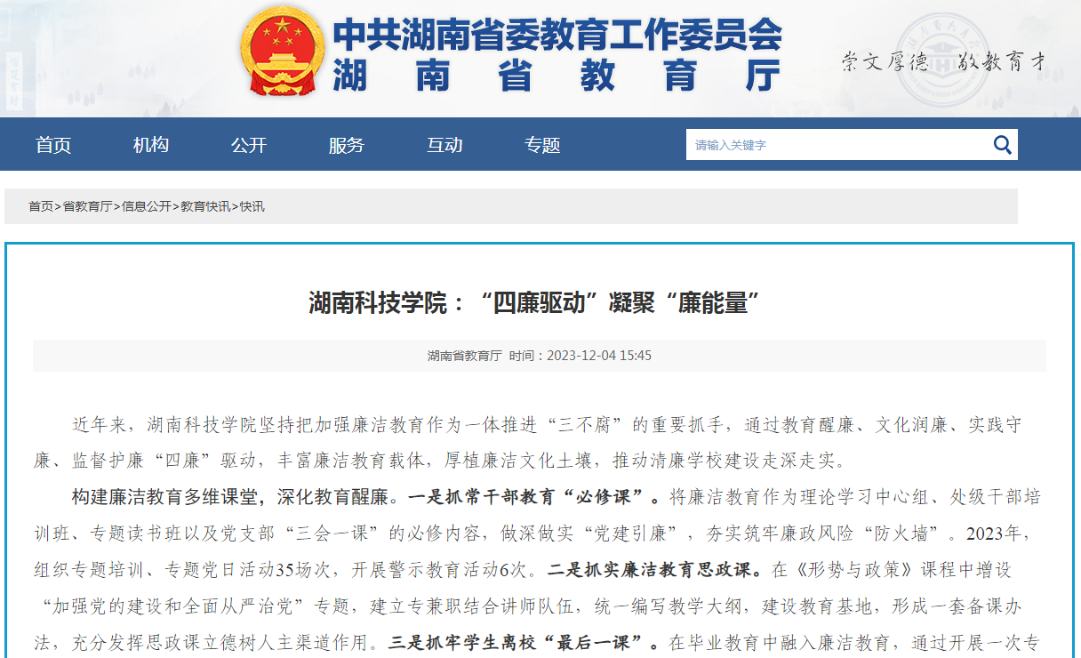 打造廉洁文化矩形阵地,深化文化润廉。一是融入校园环境。加强廉洁文化景观建设,美化了爱莲湖,兴建了廉洁文化长廊,设立了一批楼道廉洁文化宣传牌,让廉政文化景观“出门可见、随处有影”。二是融入校园文化。通过倡导《九州在线网站清廉公约》,推广使用电脑廉桌面,摆放岗位廉洁风险警示桌牌,定期开展廉洁微党课、廉洁作品创作、廉洁知识抢答赛等丰富多彩的廉洁文化进校园活动,以及在电子显示屏滚动开设“今日说廉”专栏,在“清廉湘科院”微信公众号发布微电影、小故事、廉洁寄语、漫画说纪等新媒体作品,让党员干部在“实景”“实境”中接受教育。三是融入地方资源。依托学校现有湖南省舜文化研究基地、濂溪学研究基地等平台,充分挖掘运用永州红色教育资源和地方优秀传统文化,立项省级以上廉洁教育研究课题2项,不断在传承地方文化中涵养清风正气。四是融入校地合作。与永州市纪委监委、永州市教育局共同探索推进大中小学廉洁教育一体化,组织专家团队为本地5000余名大中小学生宣讲周敦颐廉洁思想,实现廉洁教育资源共建共享。指导乡村振兴帮扶点江永县邑口村将清廉文化融入清廉村居建设,成功创建“永州市清廉乡村建设示范点”。