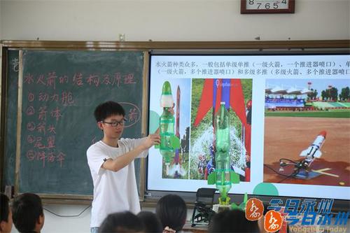 图为志愿者老师在讲解水火箭的结构及科学原理