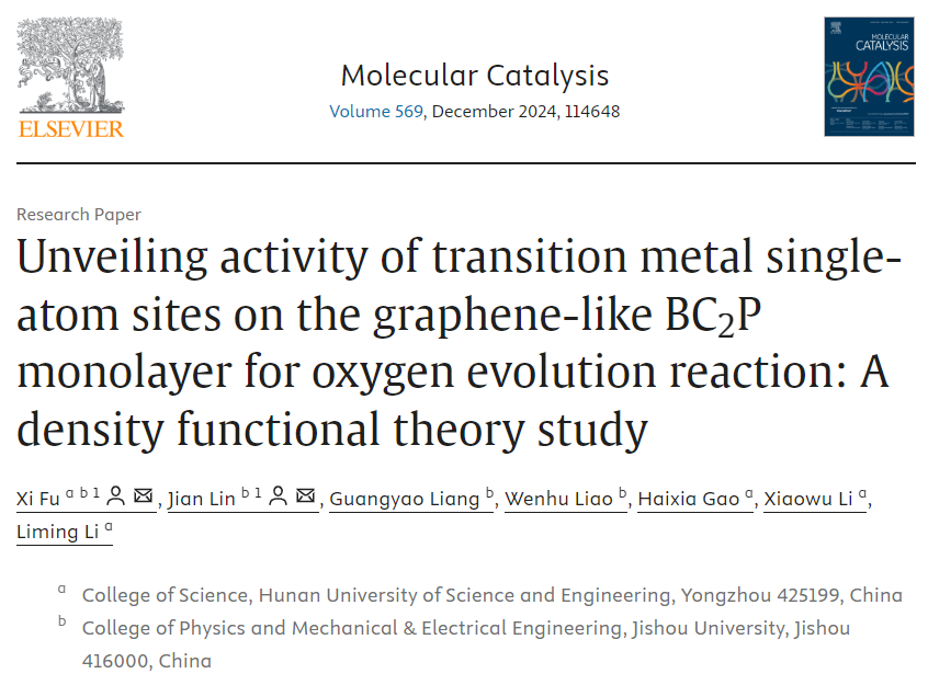 (本网讯 高海峡)近日,理学院付喜教授研究组连续完成两个研究工作成果,分别以“Density Functional Theory Study of Phosphorus Silicide Monolayers as Anodes for Lithium-Ion Batteries and Electrocatalysts for CO2 Reduction”和“Unveiling activity of transition metal single-atom sites on the graphene-like BC2P monolayer for oxygen evolution reaction: A density functional theory study”为题发表在ACS Applied Nano Materials(IF 5.3,中科院二区期刊)和Molecular Catalysis(IF 3.9,中科院大类二区)期刊上。我校为论文的第一完成单位,吉首大学为第二完成单位,付喜教授为第一作者和通讯作者,所指导的吉首大学物理学专业硕士研究生林健为共同第一作者,理学院李小武教授、高海峡副教授为共同参与作者。