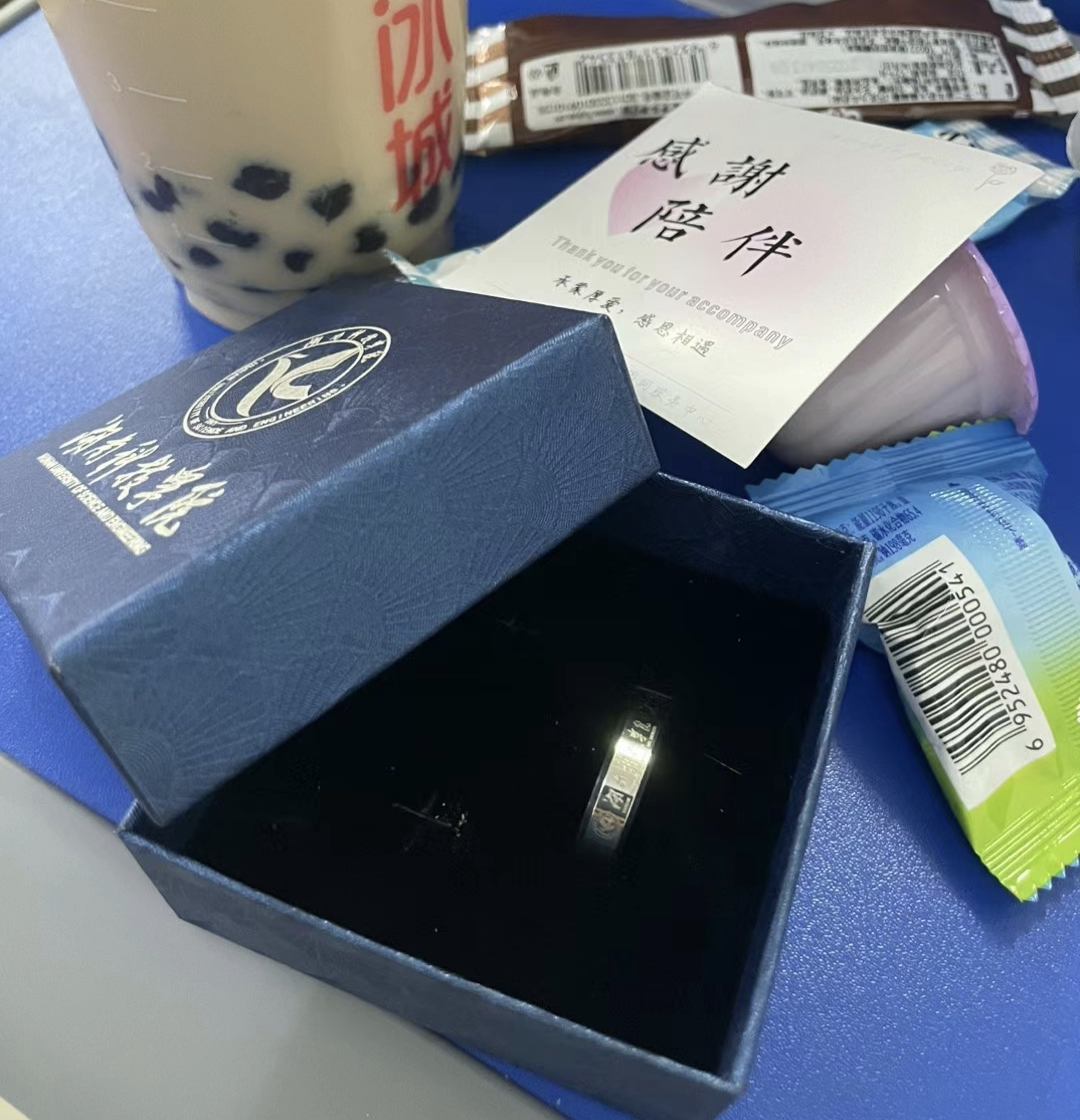 主会场议程结束后,各班级回到原自习室开展最后一次主题班会。班主任为每位毕业生佩戴定制纪念戒指——外圈镌刻“九州在线网站”校名及校徽,内壁铭刻学生班级与姓名的专属印记。在书写“我的大学回忆”明信片环节,泛着奶茶香气的教室中,学生们将四年时光凝练成300字的青春诗行。正值“520”特别日子,各班为每位同学准备了玫瑰、奶茶和零食礼包,辅导员龙枚樱说:“玫瑰寓意绽放的青春,奶茶象征生活的甘甜,零食则是学院永远温暖的守候。”