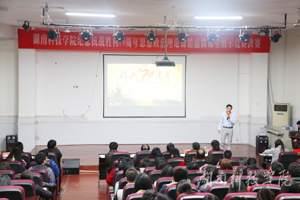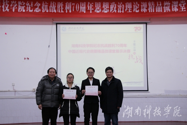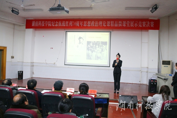 本网讯(记者 皮妍)“浩气贯长虹,激情颂先烈”,为纪念抗战胜利70周年,进一步推动思想政治理论课教学改革,12月13日晚,马克思主义学院《中国近现代史纲要》教学部在博雅楼东三教室,举行以“品评抗战历史人物,讲述抗战历史事迹,反思抗战历史得失”为主题的纪念抗战胜利70周年思想政治理论课精品微课堂展示决赛。