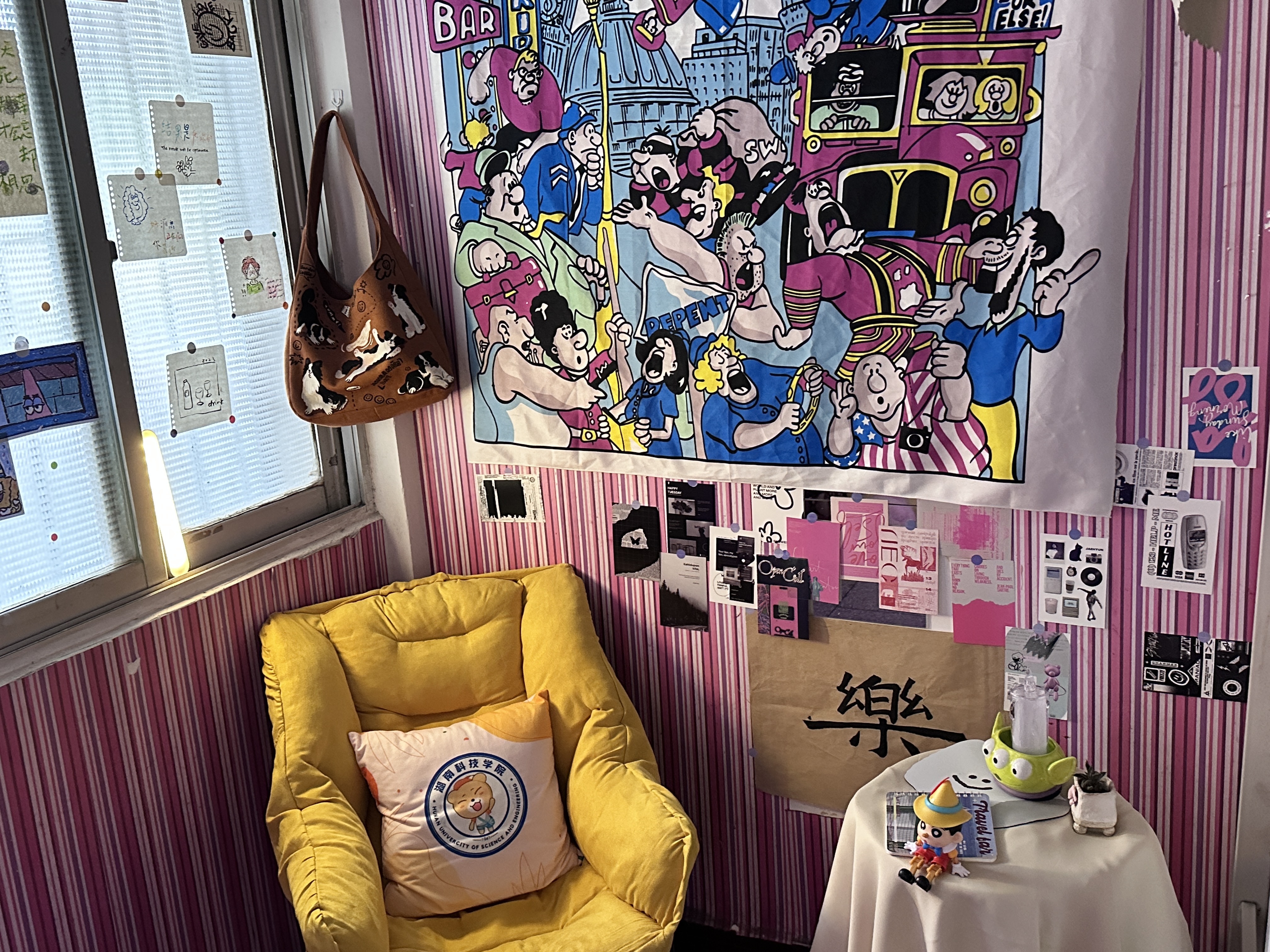 有的宿舍将照片装饰在墙壁上,用灯光点亮珍贵回忆;有的宿舍以动画元素结合撞色创意综合运用,构成温馨舒适的宿舍一角;有的宿舍在门前装饰可爱挂件,童趣与活力萦绕在眼前与心间。