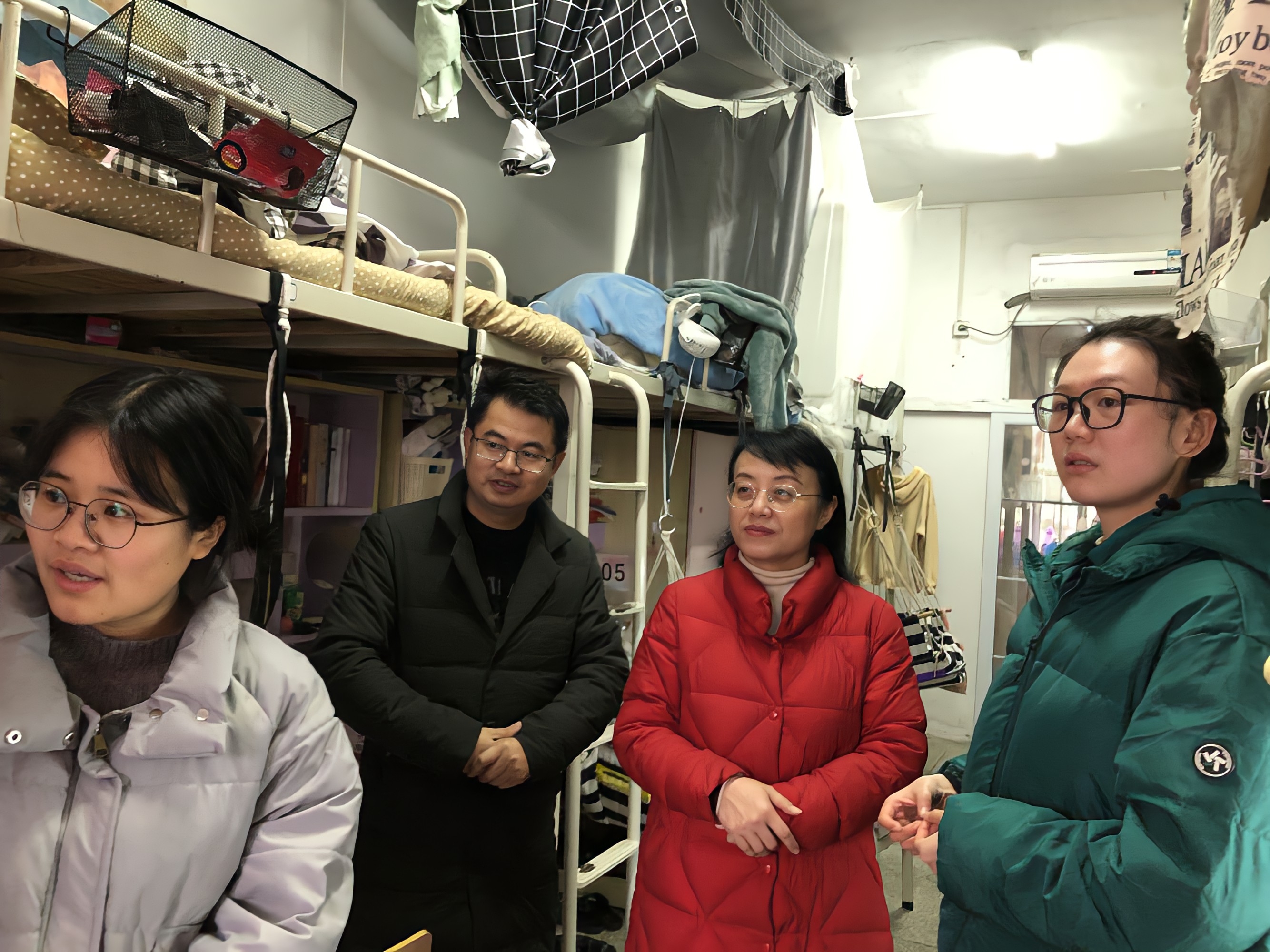 本网讯(记者 王婧)为振奋马克思主义学院考研学子士气,增强学生备考信心。12月21日,马克思主义学院院长廖雅琴、党总支书记郑向晖、党总支副书记兼副院长高丹、学工办主任王君及1801班班主任周梅、1802班班主任邓怡舟深入学生寝室,在冬至时节为我院考研学子送上考研福袋与暖心祝福。