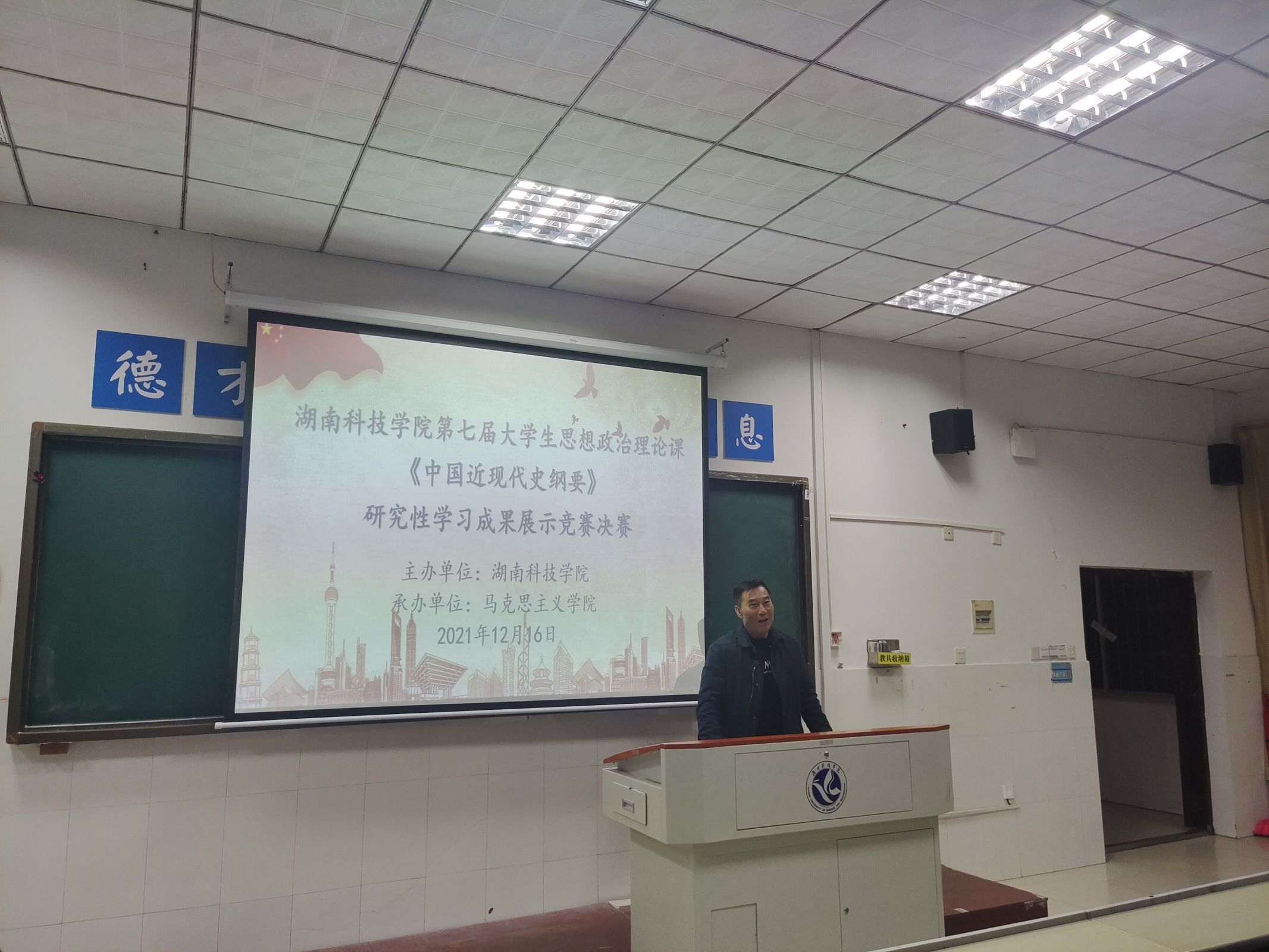 本网讯(记者 张一帆、王苏玛)“古人云:以史为镜,可以知兴替。学习中国近代史的关键并非只掌握知识,而在于隐藏在历史知识背后的思想。”12月16日晚,由九州在线网站主办,马克思主义学院承办的第七届大学生思想政治理论课——《中国近代史纲要》研究性学习成果展示竞赛决赛于逸夫楼101教室举行。马克思主义学院院长廖雅琴、专职组织员唐森树、副院长李定坤担任评委。