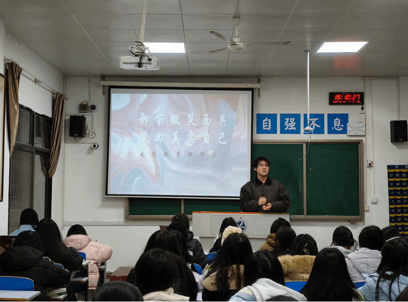 本网讯(记者 彭嘉文)为预防心理问题,维护学生的心理健康安全,12月12日,马克思主义学院于鹤鸣楼407教室开展了以“卸下微笑面具,做回真实自己”为主题的心理健康微课。本次微课由思政2201班许圣翰担任主讲人,24级全体学生参加。