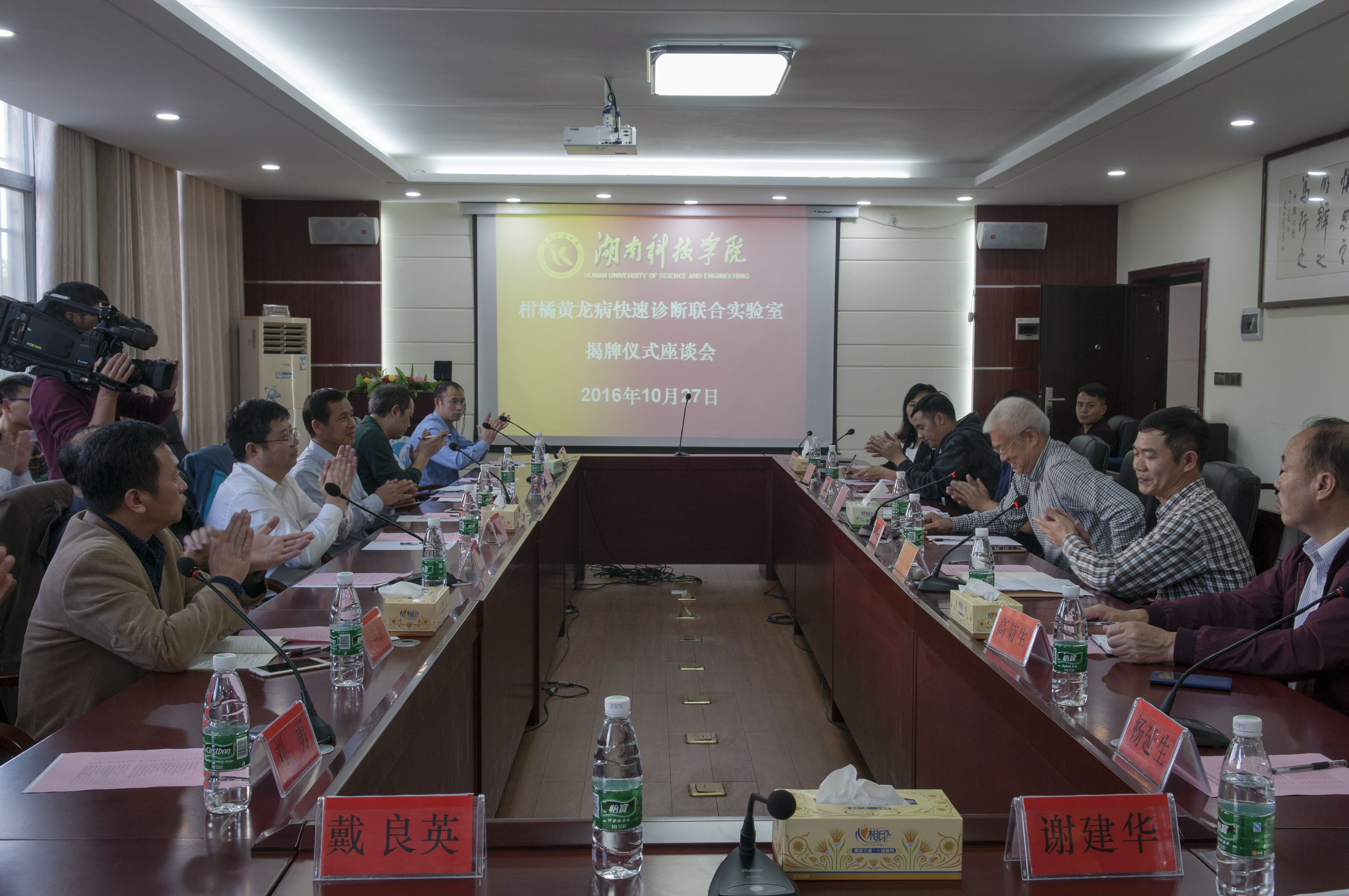 本网讯 为加强对柑橘黄龙病的诊断及防控研究,10月27日下午,由中国农业科学院植保所和我校共建的柑橘黄龙病快速诊断联合实验室揭牌成立。中国农业科学院植保所所长周雪平、副所长邱德文一行,永州市政协副主席封金祥,我校副校长吴小林、化学与生物工程学院院长何福林、湘南优势植物资源综合利用湖南省重点实验室主任李治章出席仪式参加座谈交流。