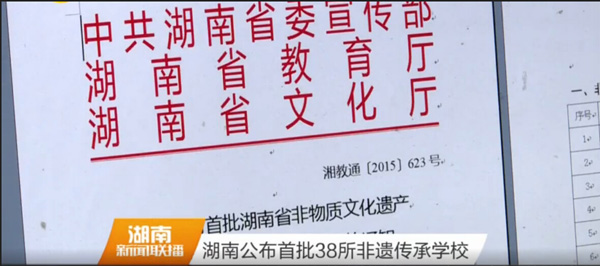 1月13日,湖南卫视新闻联播发布《湖南省公布首批38所非遗传承学校》,介绍我校《盘王大歌》等瑶文化项目。