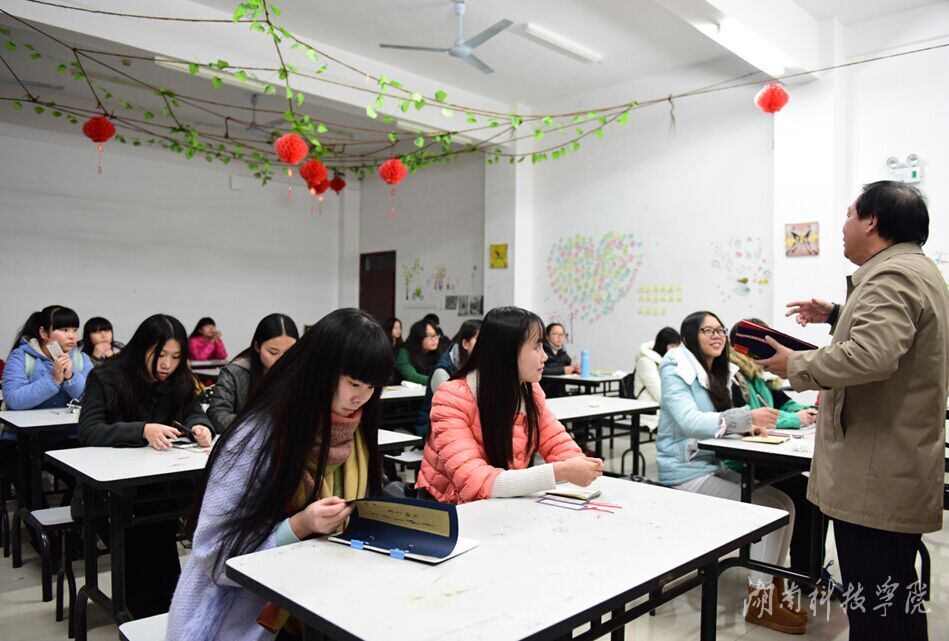 “女书笔画纤细飞扬、自由舒畅、排列工整、轻盈飘逸,正如少女翩翩起舞,又似小鸟在空中飞翔,宛若柳叶随风飘落,又像小鱼在水中游动,女书的书写关键在于熟练掌握它的笔画特点,”欧小松教授边讲授边书写着“千年女书”四个字,学员们目光都随着老师的一笔一划游动,完全沉浸在魅力女书的世界里。“折好的册页,先用重物压平待裁,将栏口叠齐整,然后齐栏,压平纸捻,将多余的部分剪去,捻端展开粘牢,重物压平,粘好封面,接着打孔钉线,自第二孔穿入,最后线打结后把针倒回到孔中,把另二股线穿入针孔中,用力把线结拉入孔中,这样一本自制的古诗线装书就完成了。”欧校长亲手教学员们一步一步动手制作着。