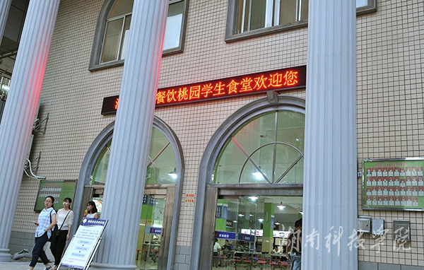 9月7日,学校开学第一天,桃园食堂装修后重新开业。食堂大门电子屏上打出了欢迎广大师生就餐的标语。