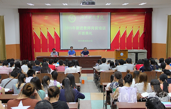 本网讯(实习记者 周芬 摄影 何帅文) “肩负时代重任,胸怀青春信念。群英荟萃在潇湘,校园永远是春天……”伴随着校歌《潇湘之歌》的嘹亮歌声,8月22日,我校在明德楼一楼报告厅举行2015年新进教师岗前培训班开班典礼。校党委委员、副校长宋宏福主持典礼,校党委委员、副校长郑山明、李常健等领导出席。