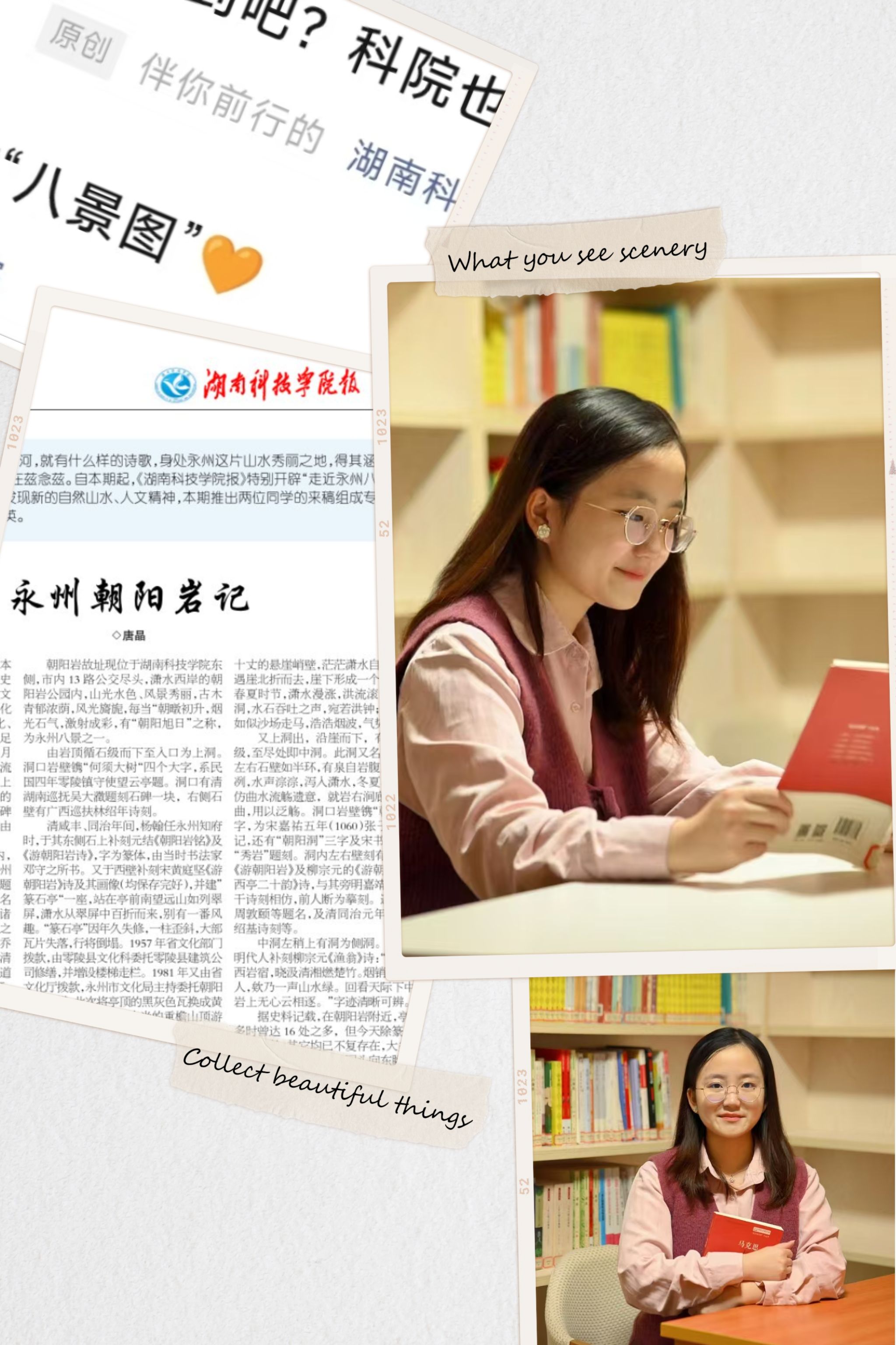 在我印象最深刻的一次创作经历中,我和十几位志同道合的伙伴共同推进并策划了一个项目——《九州在线网站报》特设的“走近永州八景”专栏。我们不仅在校内发起了征稿活动,还组织了多场线下活动,旨在鼓励师生们从全新的角度探索永州的自然美景与深厚的人文精神,以此来传递永州八景丰富的文化价值。经过团队与老师们的反复讨论和精心准备,这一专栏最终赢得了校内外广泛的好评,成为了传承和推广永州文化的一股重要力量。作为此次项目的参与者之一,我深感自豪,因为这不仅是对永州八景文化的致敬,更是对我们团队努力成果的肯定。“每一份努力都藏着未来的光芒”,这句话成为了我继续前行的动力源泉。