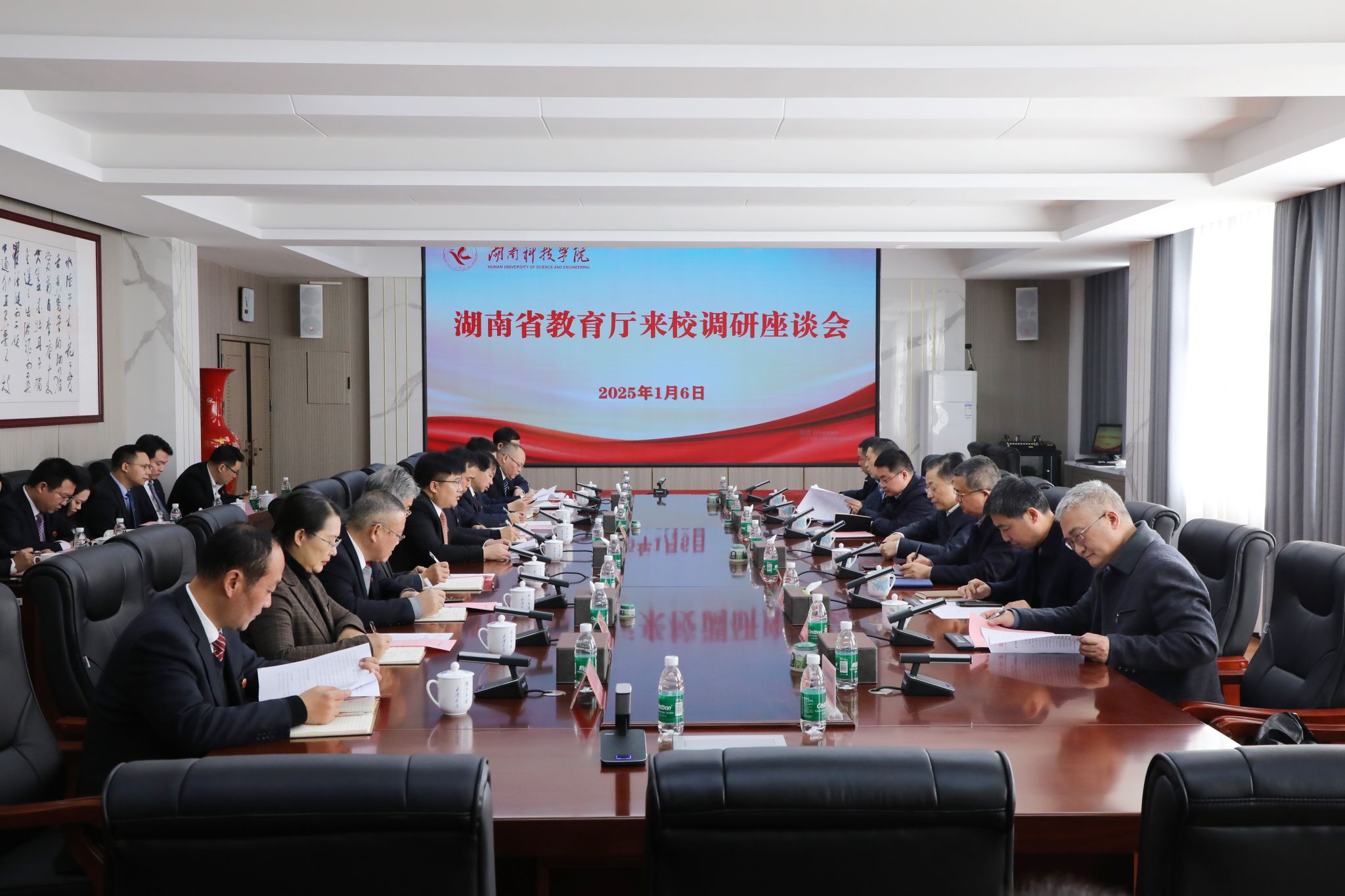 省教育厅办公室主任崔恒源、财务建设处处长黄星亮、高等教育处处长张平、学位管理与研究生教育处处长颜胜利,永州市教育局党组书记、局长黄赞校,以及学校有5关9部门、学院负责人参加调研。
