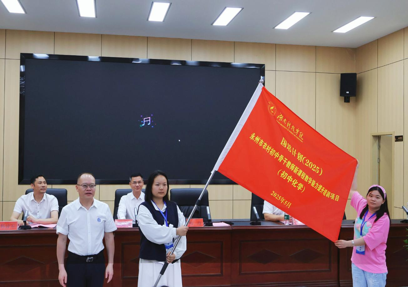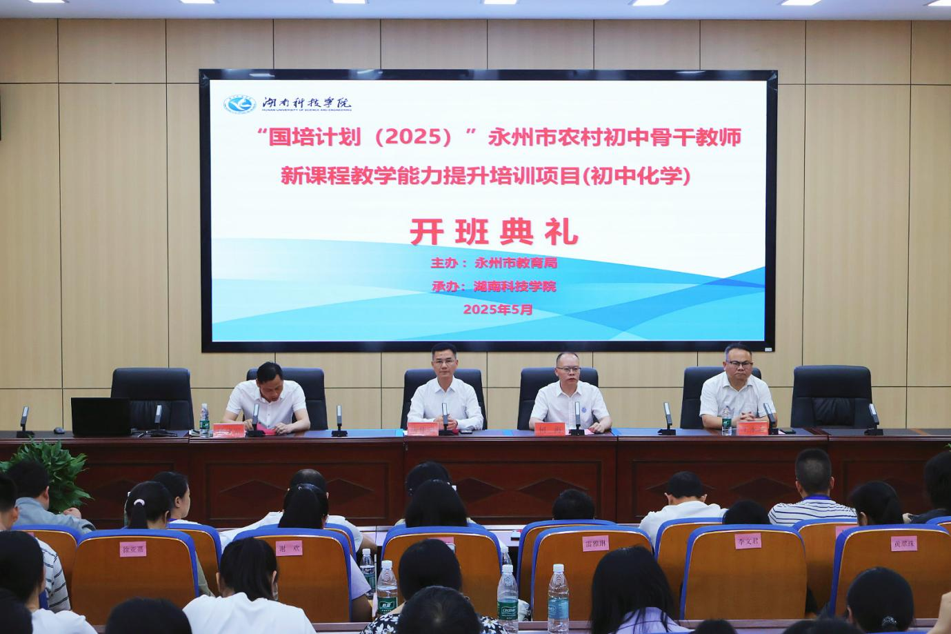 本网讯(通讯员 曹湖云 何嘉丽)5月16日上午,“国培计划(2025年)”永州市农村初中化学骨干教师新课程教学能力提升培训班在我校开班。校党委委员、副校长何海,永州市教师发展中心主任唐作明等领导出席仪式,来自永州市各县区的70名初中化学骨干教师参加开班典礼。