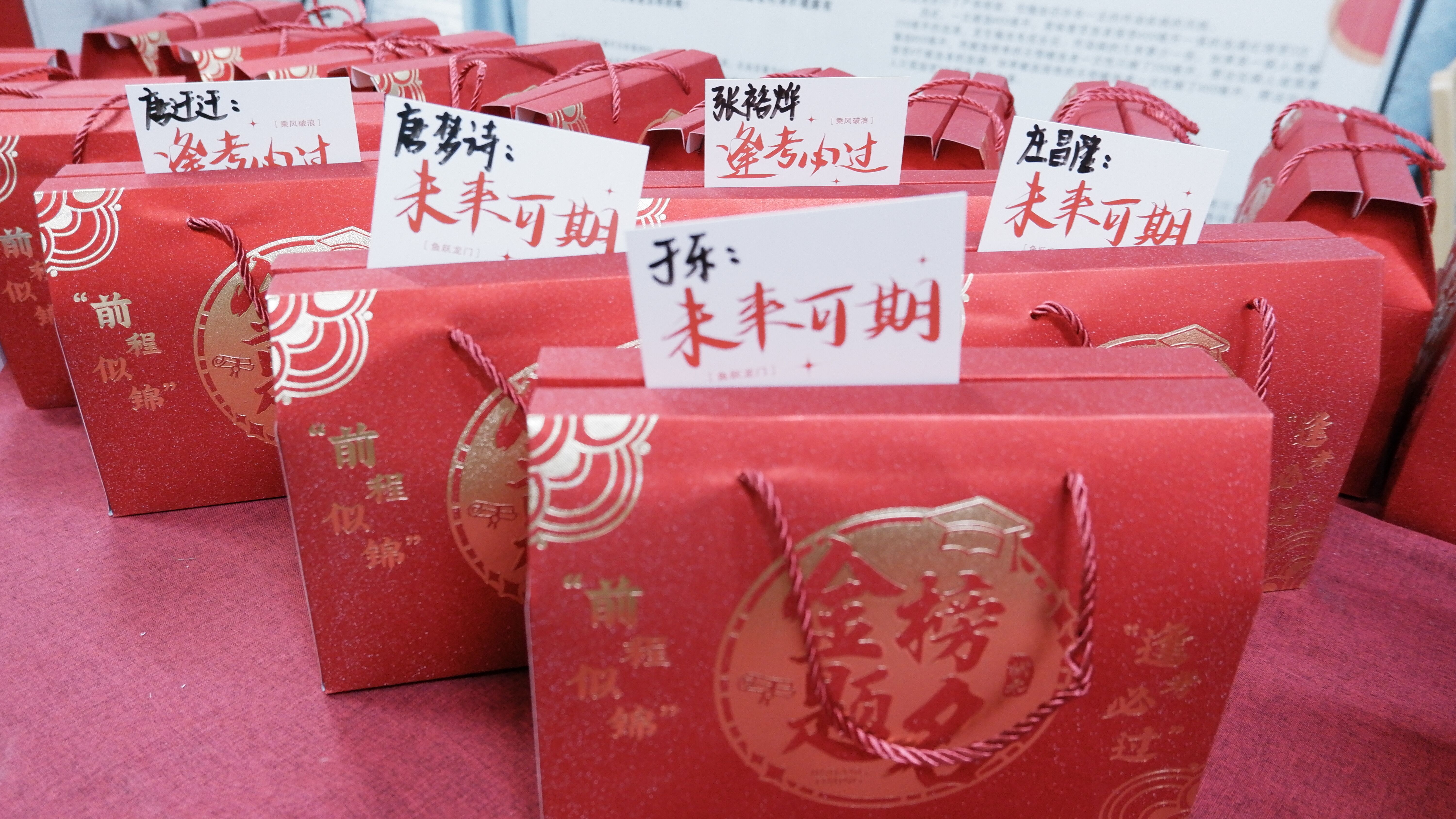 定制保温杯、暖贴、蒸汽眼罩和写满祝福的明信片……理学院用满满的仪式感为考研学子加油助威。同时召开考研加油会,为考研学生送上美好祝福,希望大家学有所成,研有所果。