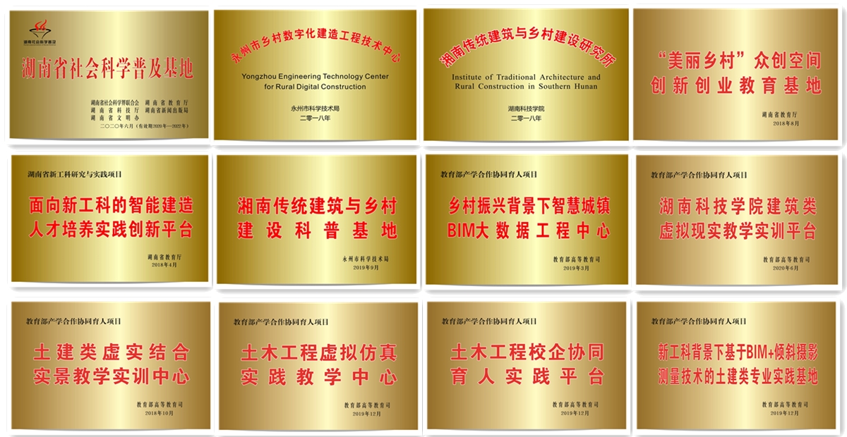 学院现有各类仪器设备价值一千余万元,包括探地雷达测试系统、飞马无人机、大疆无人机、法如三维激光扫描仪、GPS接收机、微机屏显式液压万能试验机等设备。拥有湖南省古建筑文化遗产保护传承社会科学普及基地、湖南省优秀校外实习基地、湖南省校企合作“美丽乡村”众创空间创新创业教育基地等多个省级实践教学基地,拥有BIM技术研发中心、九州在线网站湘南传统建筑与乡村建设研究所、永州市“乡村数字化建造工程技术中心”、永州市“湘南传统建筑科普基地”以及教育部协同育人“乡村振兴背景下智慧城镇BIM大数据工程中心”等实践中心。学院注重与社会多方合作办学、协同育人,与中铁、中交以及湖南建工集团等企业签署了校企合作协议;先后与广州、深圳、长沙、杭州多家知名企业建立校外实习基地、创客中心等人才培养基地。