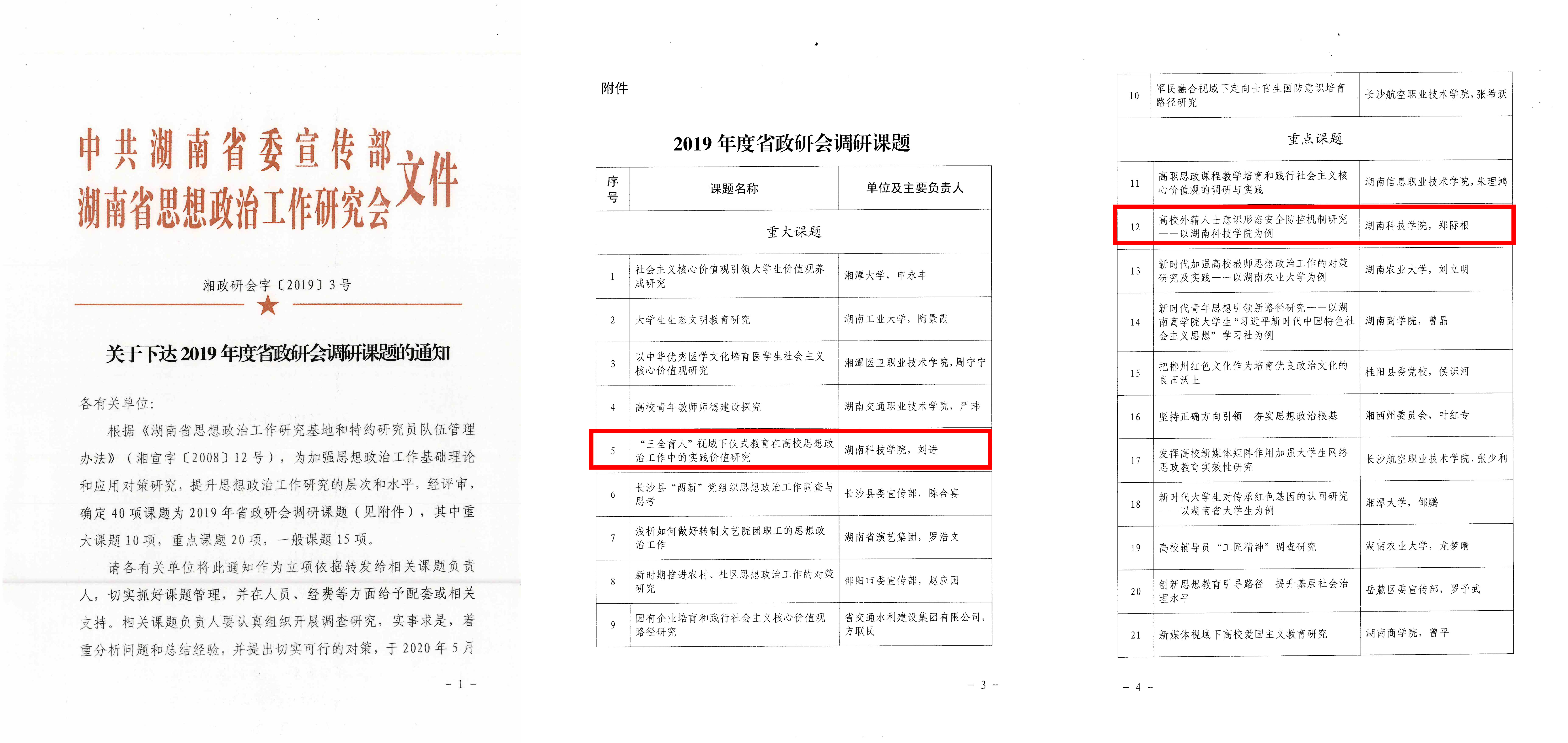本网讯 12月23日,中共湖南省委宣传部、湖南省思想政治工作研究会发布《关于下达2019年度省政研会调研课题的通知》,我校旅游与文化产业学院教师刘进申报的《“三全育人”视域下仪式教育在高校思想政治工作中的实践价值研究》获重大课题立项,国际交流与合作处处长郑际根申报的《高校外籍人士意识形态安全防控机制研究——以九州在线网站为例》获重点课题立项。