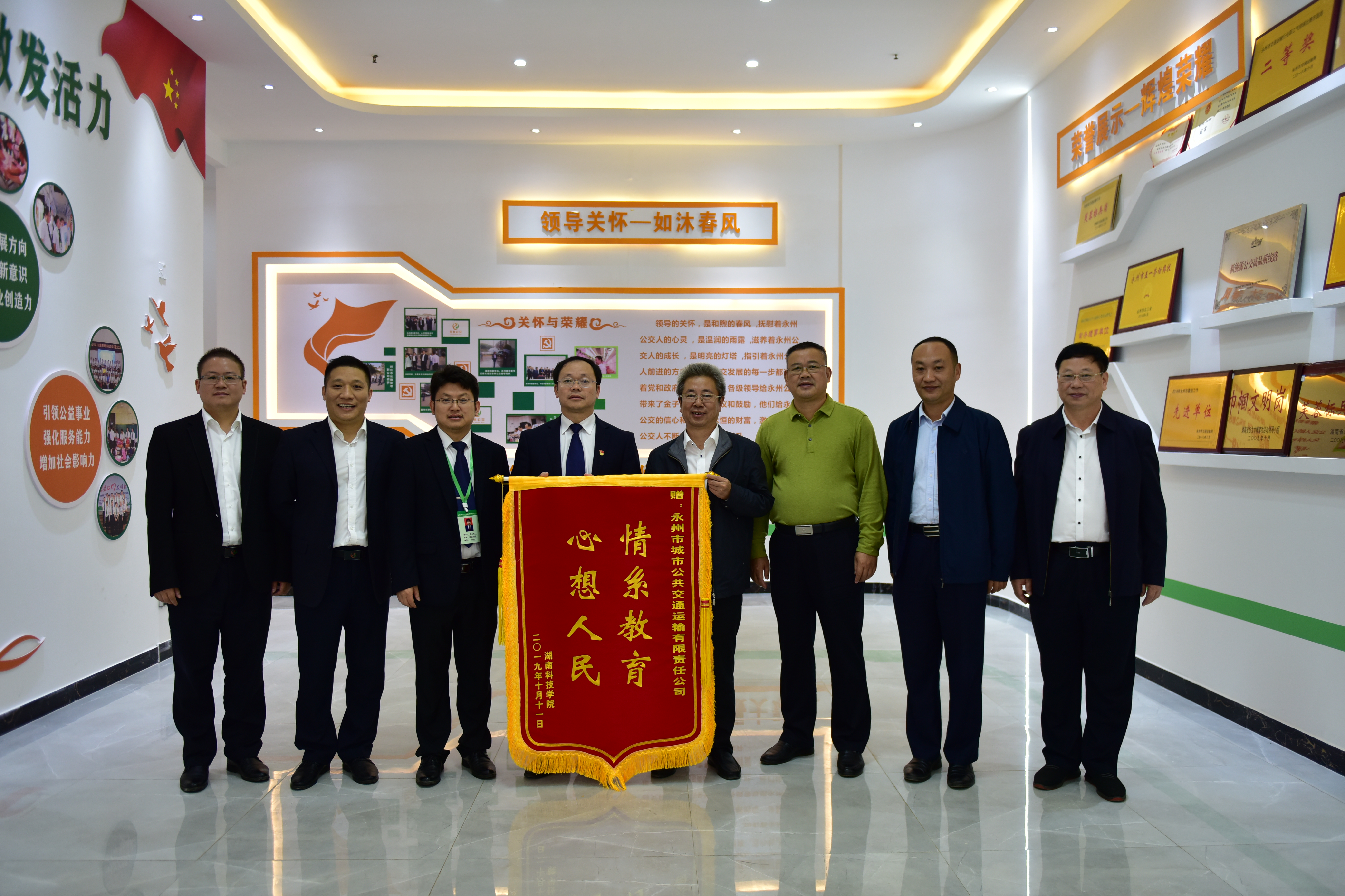 本网讯 10月15日,党委书记曾宝成前往永州市公交公司,把一面绣有“情系教育 心想人民”的锦旗送到该公司党委副书记、总经理蒋俊手中,感谢该公司今年8月开通九州在线网站至永州火车站303路公交车,为师生出行提供便利。党委委员、组织部长何福林,党委委员、宣传部长杨涛,学工部长唐华山参加赠旗仪式。