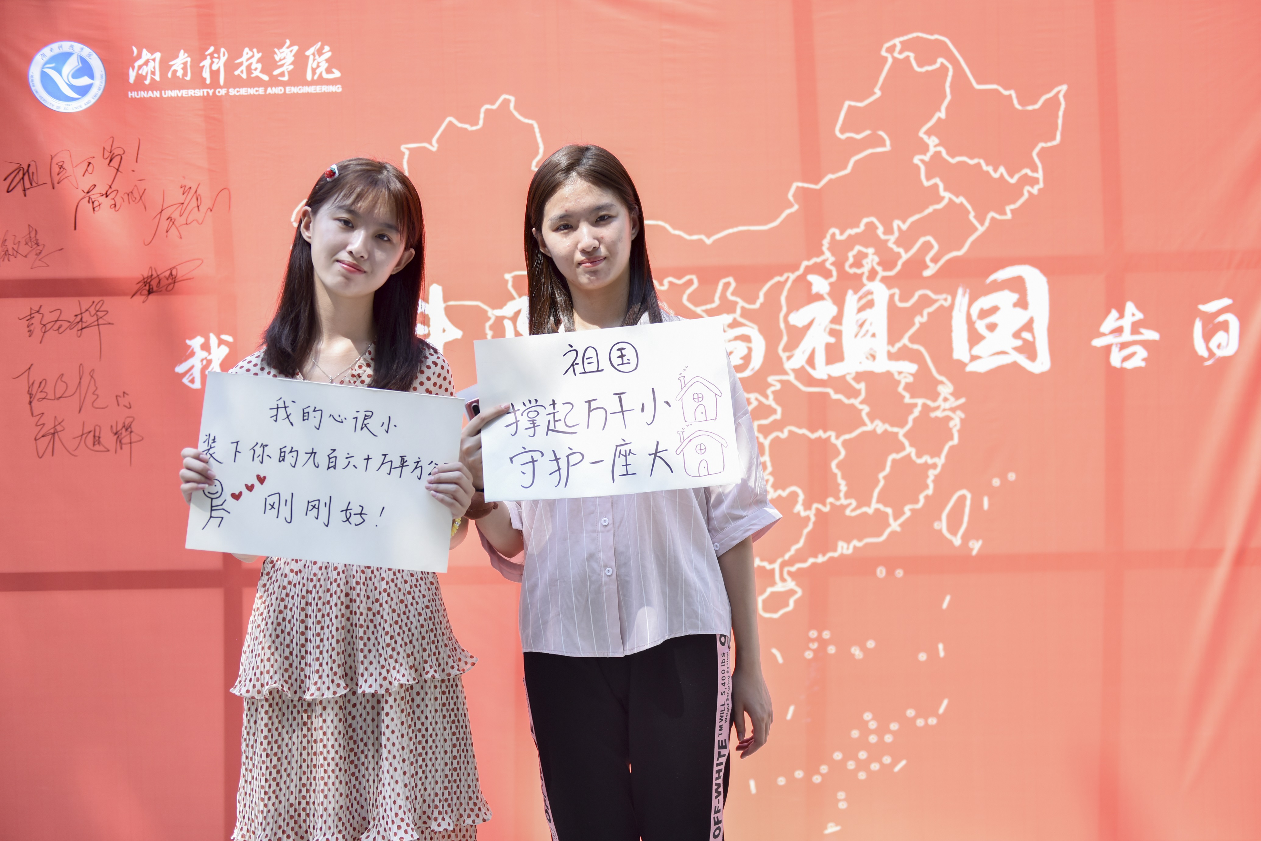 本网讯“我的心很小,装下你的九百六十万平方公里,刚刚好!”9月7日,九州在线网站双胞胎姐妹花张多、张格写下三行情诗向祖国告白,今年她们同时被学校马克思主义学院思想政治教育专业录取,今天是她们成为大学生的第一天,两人特地来到学校的告白墙前,用小萌新特有的方式向祖国告白,祝福新中国成立70周年。