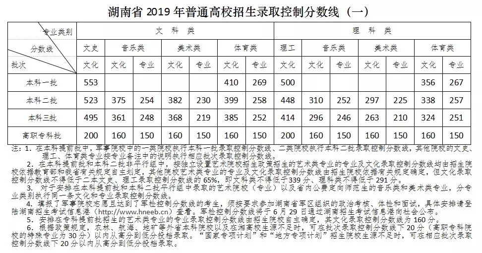 本网讯 49.9万湖南考生注意,高考放榜啦!刚刚,省教育厅召开新闻发布会,公布今年高考成绩情况及录取控制分数线: 文科一本553分,二本523分,三本495分,高职专科200分;理科一本500分,二本448分,三本414分,高职专科200分。 根据省教育考试院的安排,6月26日至27日将填报民航飞行学员志愿、本科提前批志愿;6月26日至7月1日填报本科一批至高职专科批志愿;7月8日至8月23日进行投档录取。我省将坚决执行教育部“30个不得”和我省“不点录”“不补录”“不违规降分录取”等政策规定,严格执行招生计划,继续深入实施“阳光工程”,纪检监察部门将进驻录取现场进行全程监督,还将主动接受考生和社会各界的监督,确保招生录取规范透明、公平公正。