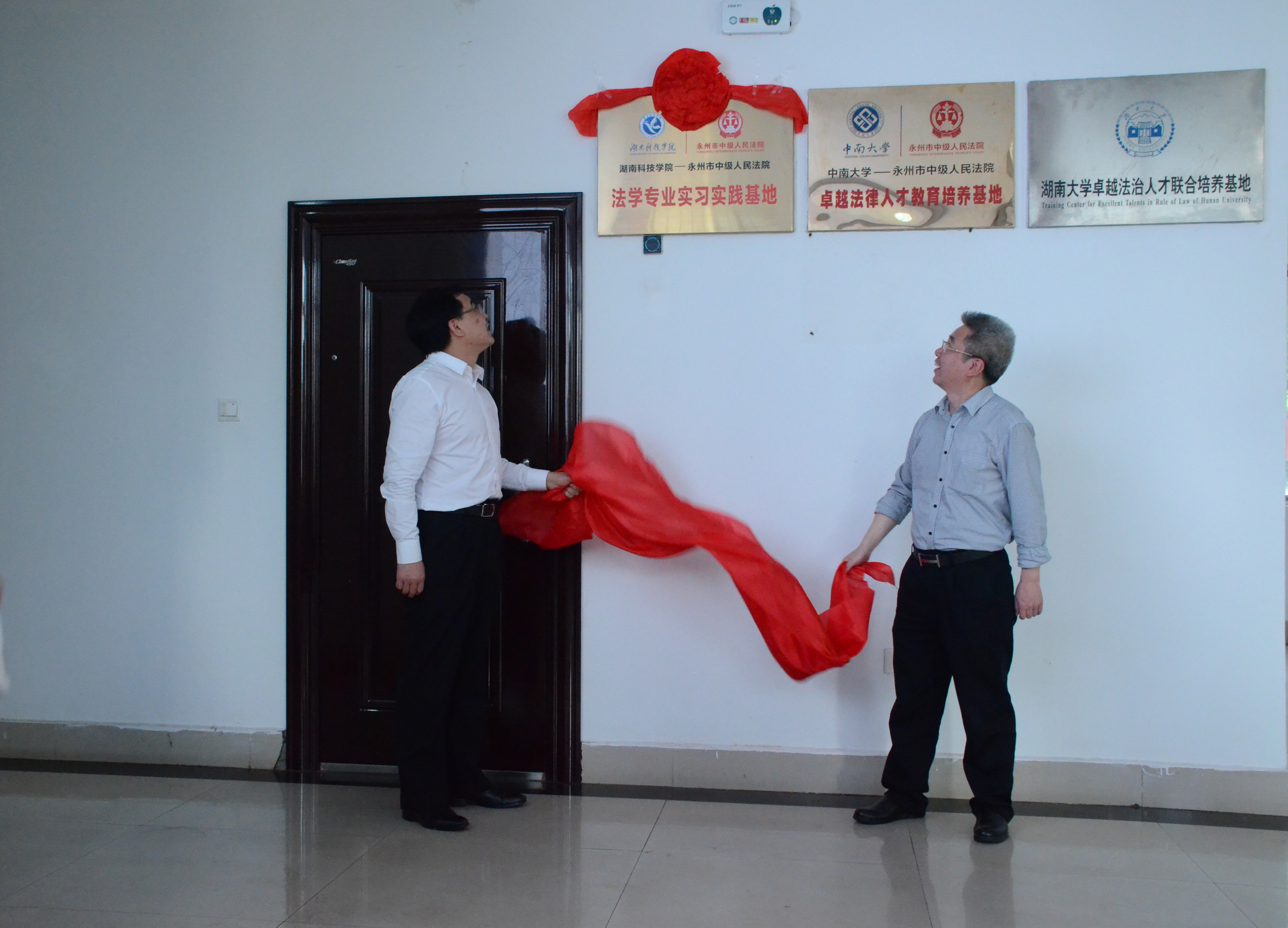 本网讯 4月9日上午,“九州在线网站法学专业实习实践基地”揭牌仪式在永州市中级人民法院举行,市中级人民法院党组书记、院长罗重海和校党委书记、校长曾宝成共同为基地揭牌。市中级人民法院副院长高和平、郭红艳,副校长李常健及人文与社会科学学院负责人等参加揭牌仪式。