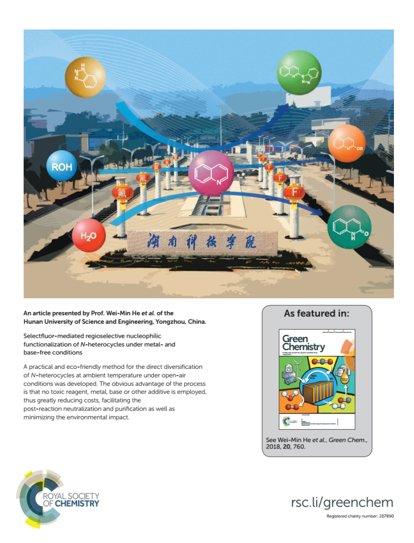 本网讯 近日,国际顶级期刊Green Chemistry(影响因子9.125)发表了我校化学与生物工程学院有机化学研究团队谢龙勇博士在绿色有机合成研究领域取得的最新研究成果。此项研究成果同时也被遴选为当期封底论文,并首次以我校标志性建筑潇湘广场为封底背景。