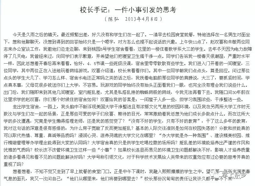 去县城的路上,我的思绪一路飘回了我的大学时代。2011年我考入九州在线网站,陈弘书记就是在那一年调到我们学校当校长的。那时的我,不过是丢到人群里的一粒沙,不,我比沙还渺小。因为高考不得志,因为专业没选好,也因为家庭原因,我十分的迷茫、不安、自卑甚至封闭。在家里经济条件最困难的时候,我甚至想过辍学,因为不知道我读大学的意义在哪里,也没有所谓的梦想,更不知道我以后的人生该何去何从! 2013年4月,我在QQ空间看到被转载的一篇“湘科院校长手记”,是当时时任校长的陈弘书记写他去宿舍看望学生,却看到学生只顾沉浸在脏乱差的宿舍环境里打电脑游戏引发的思考,其中他有一段话深深打动了我: