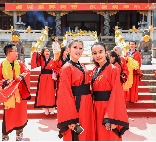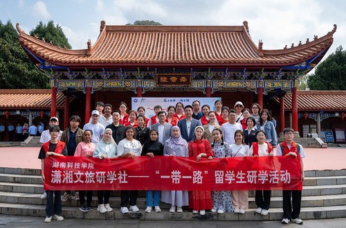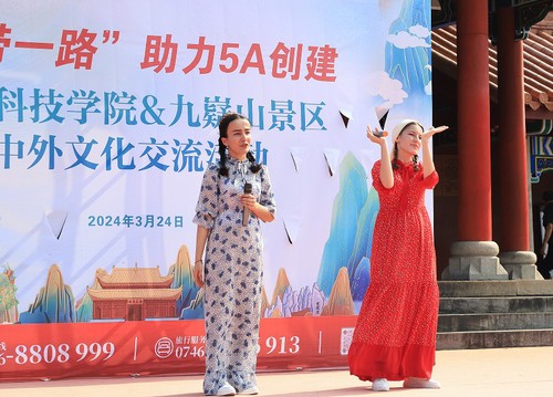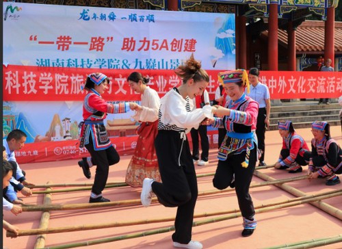 中外学生还在舜帝陵广场开展中外文化交流活动。经典国风的京剧表演、独具地方民俗特色的竹竿舞、活泼欢快的土库曼斯坦舞蹈、悠扬婉转的阿尔及利亚歌曲演唱等表演轮番上演。留学生们与在场人员一同植下了象征国际友谊的“友谊常青树”。