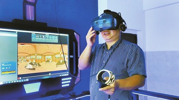 记者体验VR影像游览。湖南日报全媒体记者 黄柳英 摄