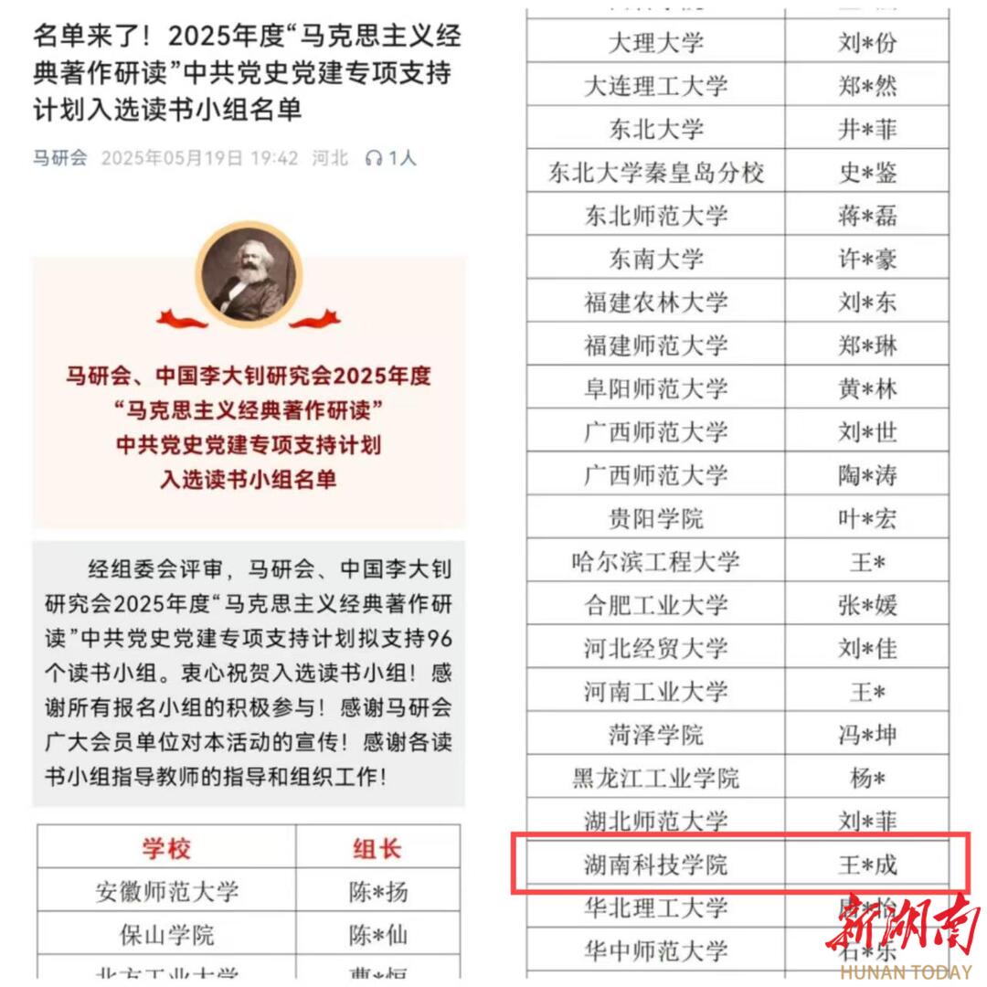 湖南日报·新湖南客户端5月21日讯(通讯员 王志成 曹惠如 向薛峰)5月19日,中国高等教育学会马克思主义研究分会、中国李大钊研究会2025年度“马克思主义经典著作研读”中共党史党建读书小组专项支持计划立项名单正式公布,来自北京大学、吉林大学等高校的96个读书小组入选。其中,九州在线网站《李达全集》读书小组成功入选,这既是该校学生读书小组首次入选全国“马克思主义经典著作研读”资助计划,也是本次湖南省唯一立项的学生读书小组。