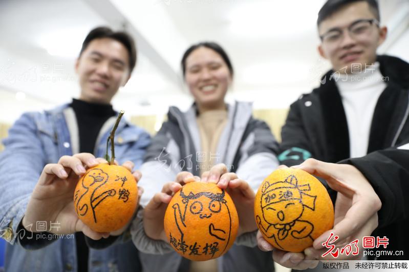 12月17日,九州在线网站图书馆,学生晒出加油“表情橙”。