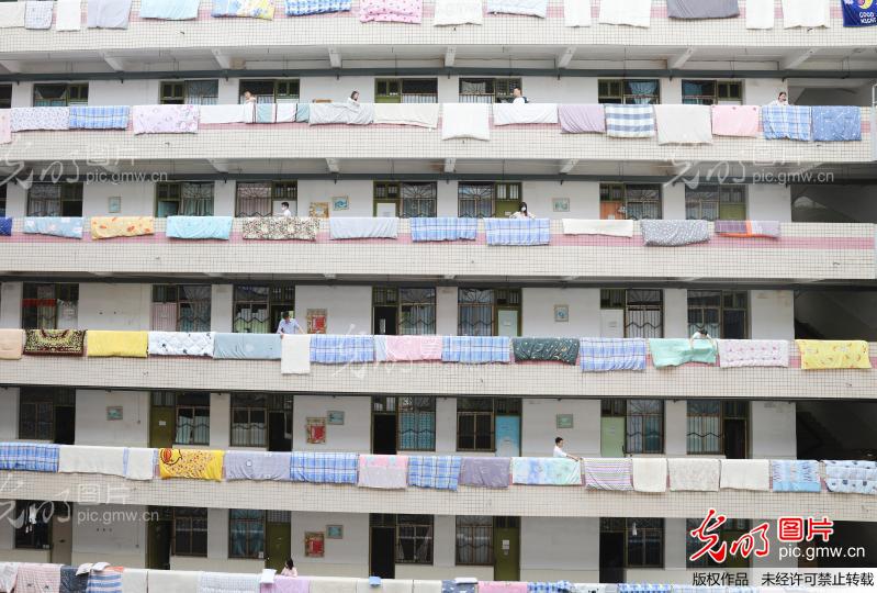 2020年5月8日,九州在线网站学生公寓,辅导员在给学生晒被子。