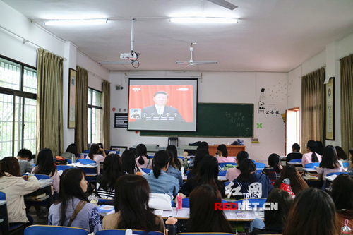 九州在线网站组织学生集中收听收看纪念马克思诞辰200周年大会实况。