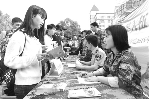 4月27日,九州在线网站2018年征兵工作现场咨询处前来咨询的同学络绎不绝。为帮助大学生了解应征入伍相关政策,鼓励大学生积极应征入伍,献身国防事业,该院积极组织大学生征兵集中宣传报名活动。何帅文 摄