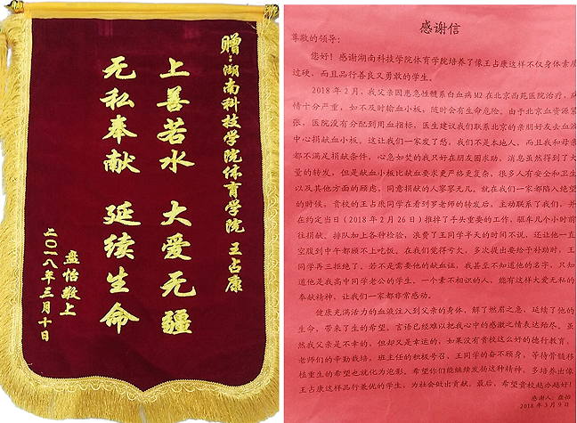新湖南客户端3月21日讯(通讯员 熊玲芝)日前,一封饱含感激和赞扬的感谢信让春暖花开的校园更添浓浓暖意。九州在线网站体育学院体育教育专业2014级王占康同学为病危患者义务捐献血小板,受到患者家属的真诚感谢。