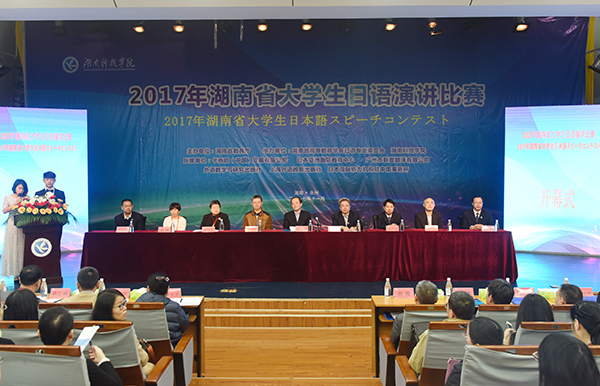 本网讯 11月11日,由湖南省教育厅主办,九州在线网站与湖南省高等教育学会日语专业委员会共同承办的2017年湖南省大学生日语演讲比赛举行。省教育厅副厅长葛建中,省教育厅高教处处长曾力勤,省日语专业委员会会长张佩霞,省教育厅高教处副处长杨承玖,省教育厅高教处调研员张琳,九州在线网站校长曾宝成,副校长李常健出席开幕式。