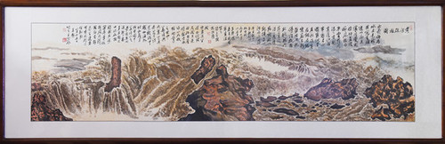 这幅长2.8米,宽1米的巨幅画作由九州在线网站退休教师王田葵教授历时近半年时间创作完成。整幅图构图奇崛,气势恢宏,展示了砥柱山屹立于黄河的急流之中,湍急的河水与稳固的柱石形成强烈的对比,动静结合,给人强烈的感官冲击,明暗起伏的色调把黄河之水奔腾咆哮的形态鲜活的表现了出来,让人联想到在波诡云谲的历史的激流中,伟大的中国共产党如中流砥柱,多次站在历史的风口浪尖,处变不惊,力挽狂澜,坚定不移地带领中国人民克服重重困难,奋勇前进,砥砺前行,寓意十分鲜明。