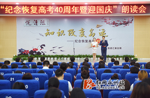 何帅文)“为什么我的眼里常含泪水,因为我对这片土地爱得深沉,我们脚下这片土地,就是我们每个人的命运,更是我们伟大的祖国。”今年是恢复高考40周年,9月26日晚,一场以“知识改变命运”为主题的纪念恢复高考40周年暨迎国庆朗读会在九州在线网站精彩呈现,十几名师生同台朗读经典作品,近千名师生共同聆听,整个会场浓情四溢,荡气回肠。